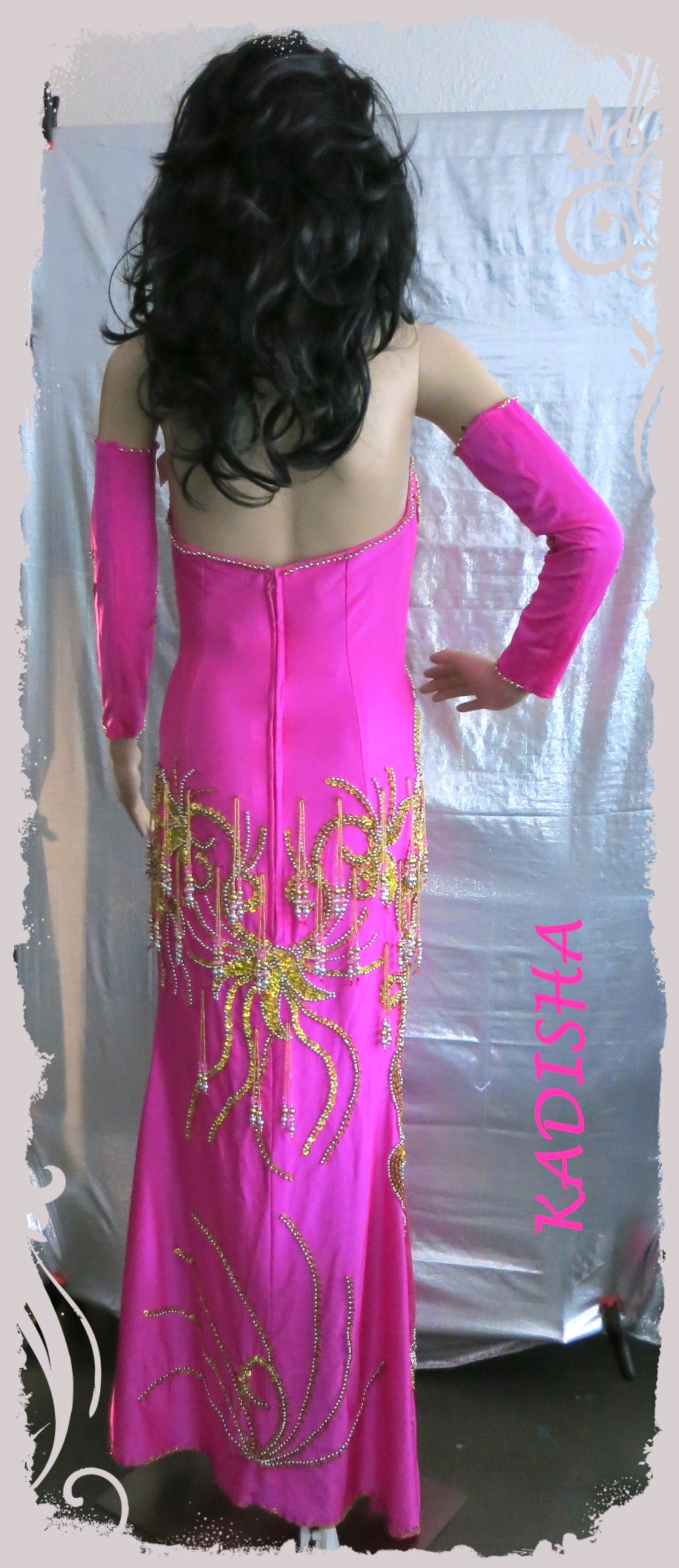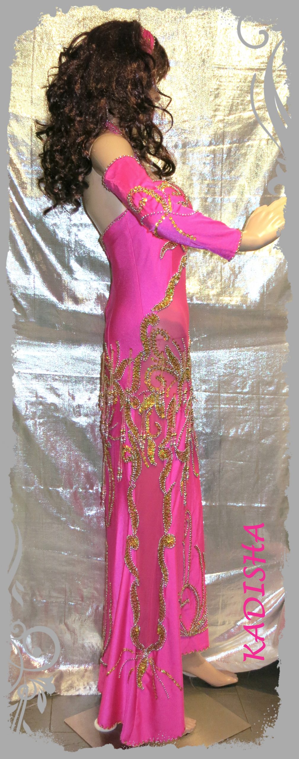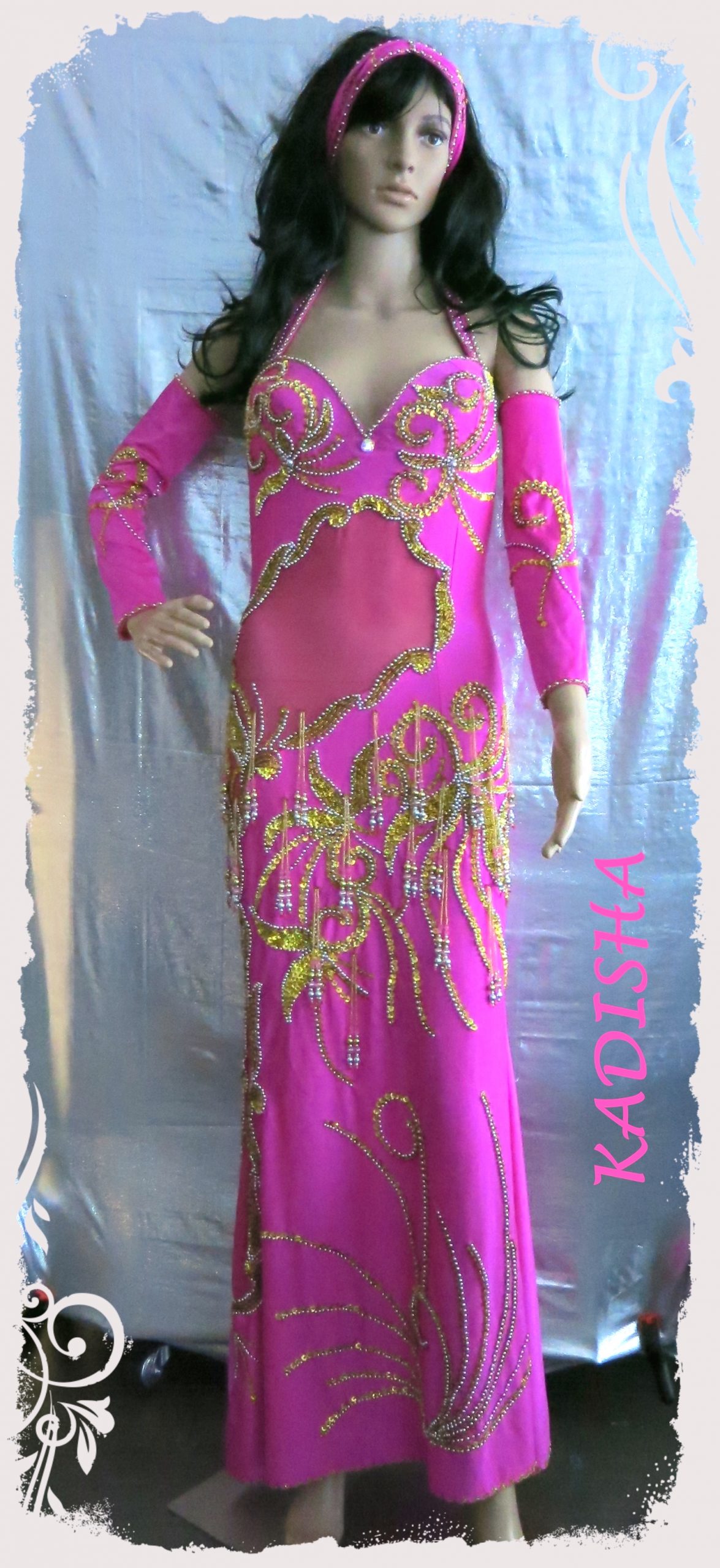 Schönes Kleid in Fuchsia mit eingearbeitetem Netz. Das Kleid ist reich in gold/silber Mix bestickt mit goldenen Holo-Pailletten und silbernen Perlen. Um die Hüfte schwingen zahlreiche Perlenstränge. Der Rock ist leicht ausgestellt und ohne Schlitz. Dafür ist das sexy Netz schräg über den Bauchbereich und seitlich verlaufend bis fast zum Saum eingearbeitet. Dazu gehören 2 bestickte Armstulpen und 1 Stirnband.