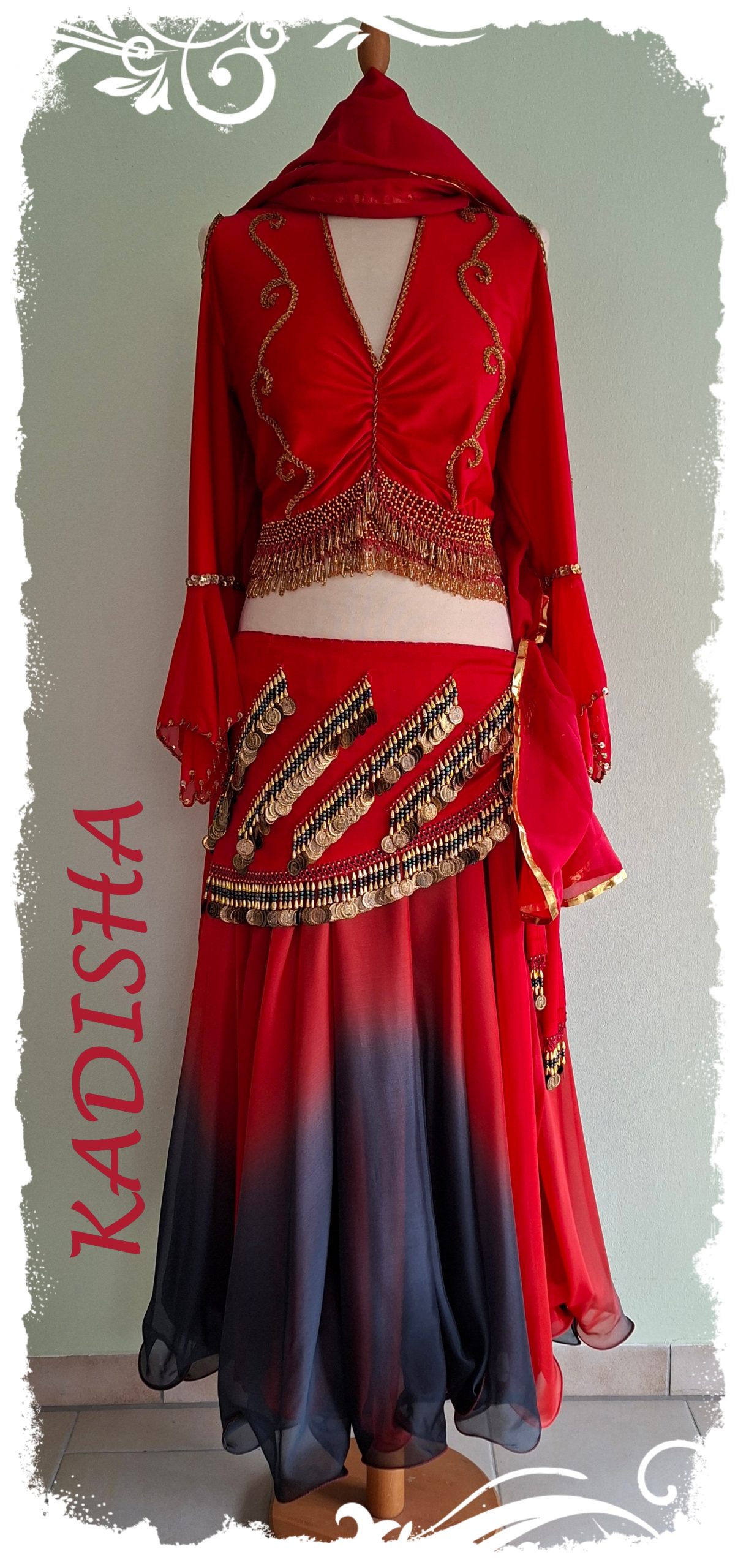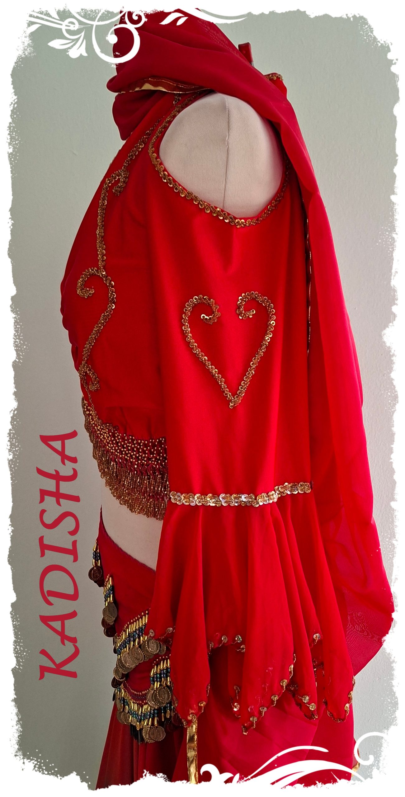 Das Oberteil in einem leuchtendem rot ist mit goldenen Perlen und Pailletten bestickt und hat 2 Reihen Perlenborten. Hingucker sind die Ärmel mit Öffnungen an den Schultern, und den flatternden Chiffonteilen. Es ist super bequem – durch den eingezogenen Unterbrustgummi kann das Top nicht hoch rutschen und sitzt perfekt bei kleiner bis großer Oberweite.