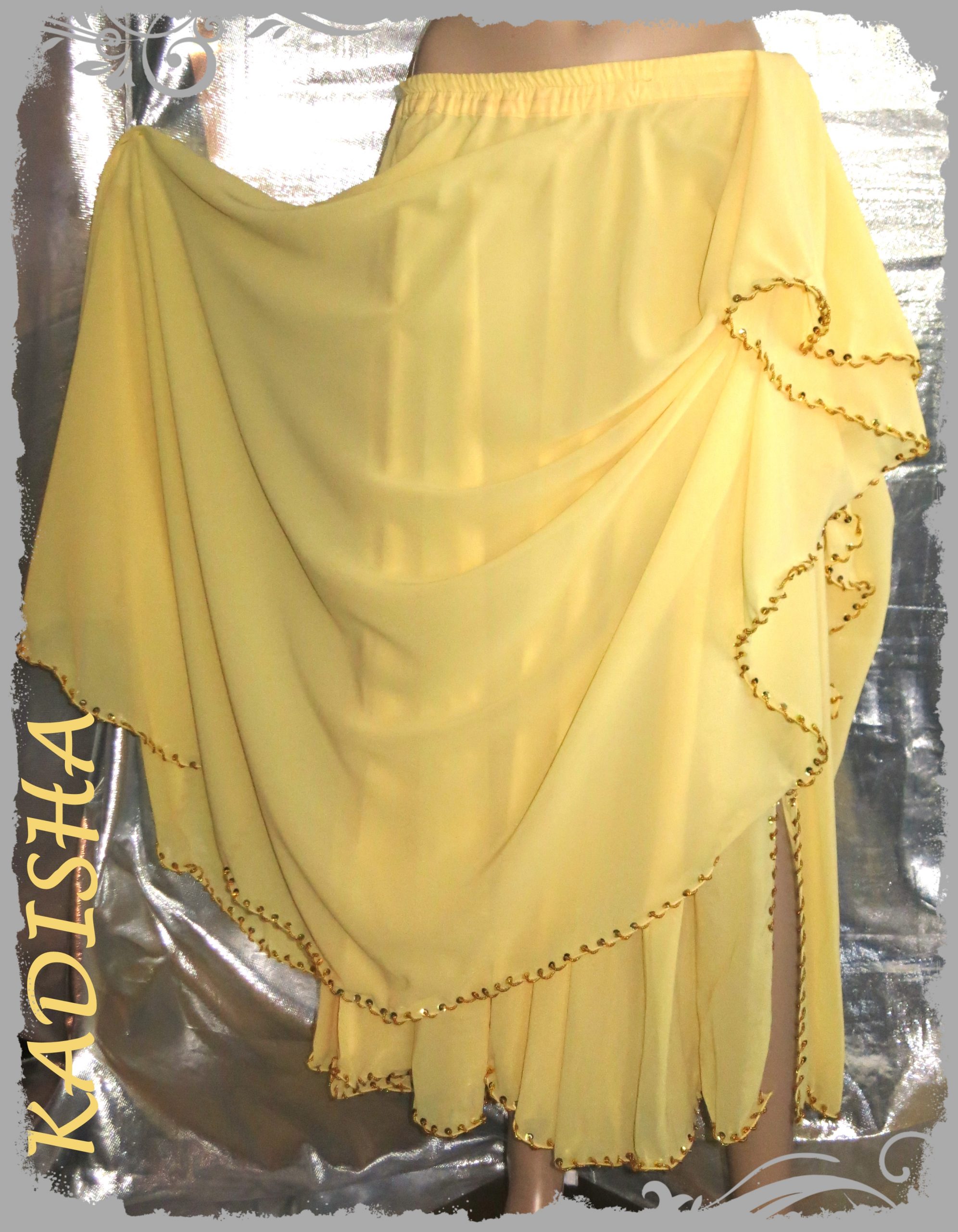 Klassischer 2- lagiger Bauchtanzrock in gelb. Der Rock hat 2 ganze Stoffteller und ist in 2 Lagen verarbeitet. Der Unterrock ist seitlich geschlitzt. Rundherum ist er mit goldenen Perlen und Pailletten bestickt. Der eingearbeitete Silk sorgt für einen schönen Wellsaum. Sehr attraktiv sieht es aus, wenn man eine Rockseite hoch steckt, dabei blitzt der bestickte Seitenschlitz des Unterrockes hervor.