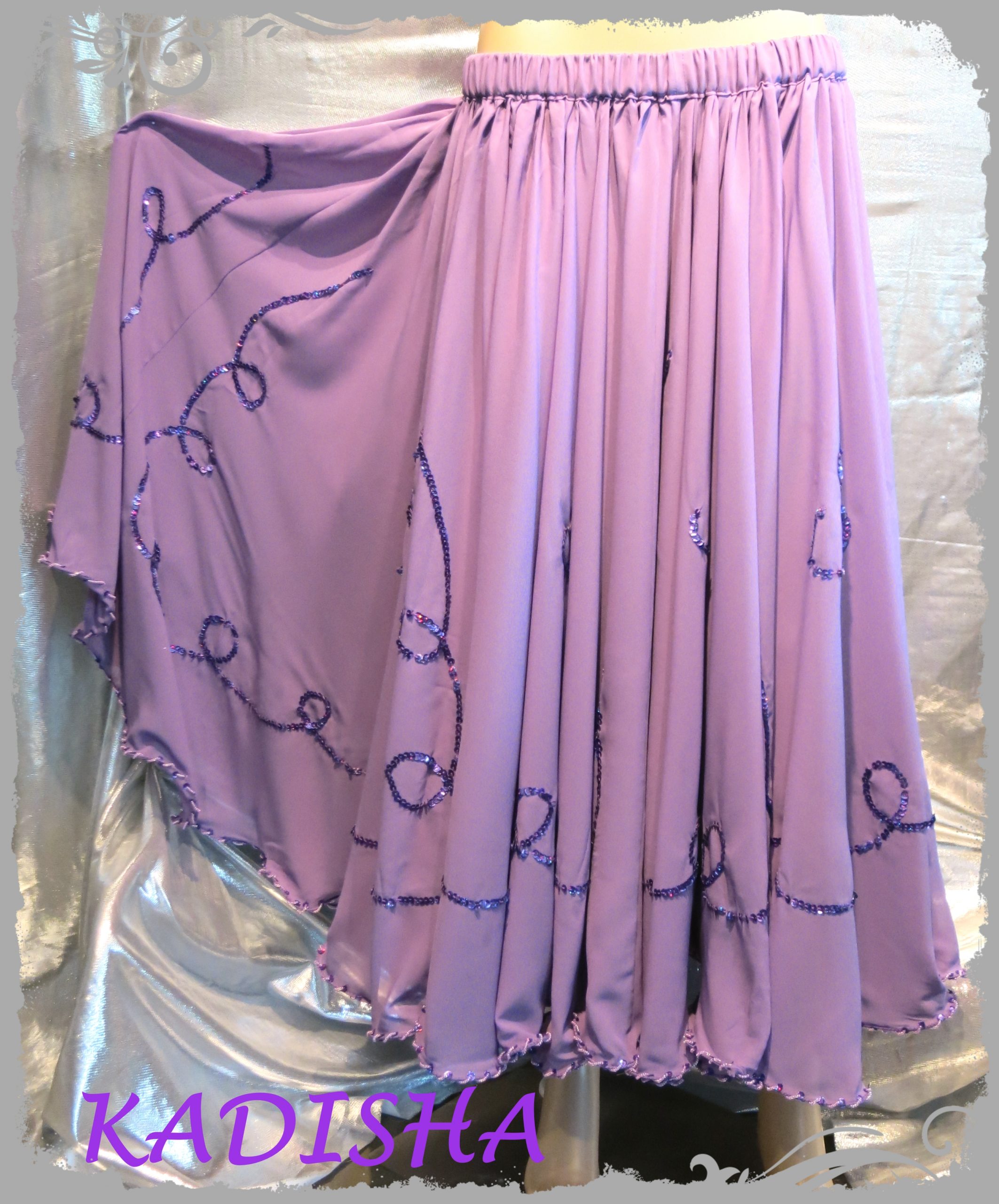 Klassisch mit Holo-Pailletten und Perlen bestickter Bauchtanzrock. 2 ganze Stoffteller sind in 1 Lage verarbeitet, dadurch schwingt er sehr weit. Der eingearbeitete Silk sorgt für einen schönen Wellsaum. Seitlich ist der Rock mit einem Haken zu schließen.