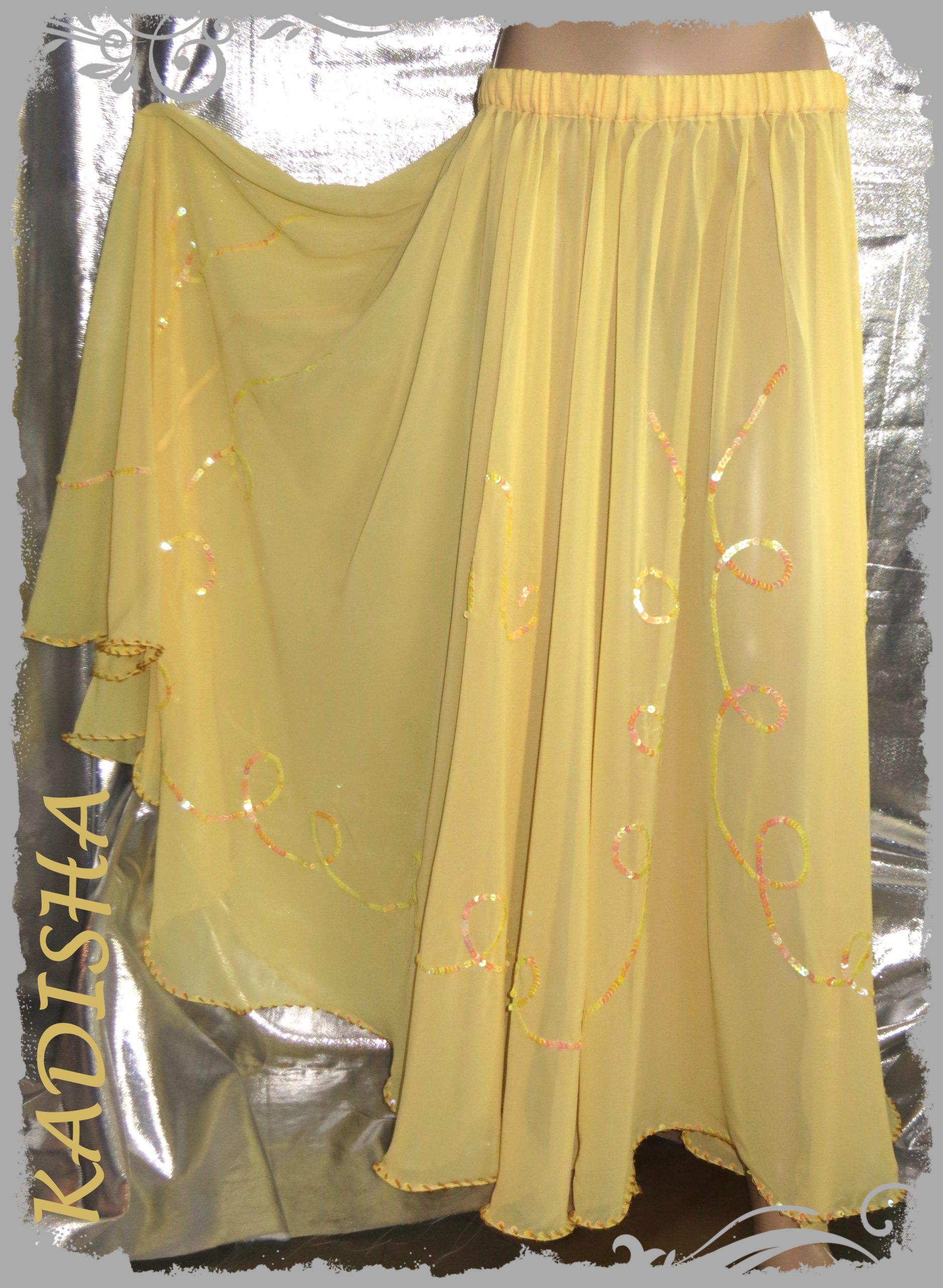 Klassisch mit  irisierenden Pailletten und Perlen bestickter Bauchtanzrock. 2 ganze Stoffteller sind in 1 Lage verarbeitet, dadurch schwingt er sehr weit. Der eingearbeitete Silk sorgt für einen schönen Wellsaum. Seitlich ist der Rock mit einem Haken zu schließen.