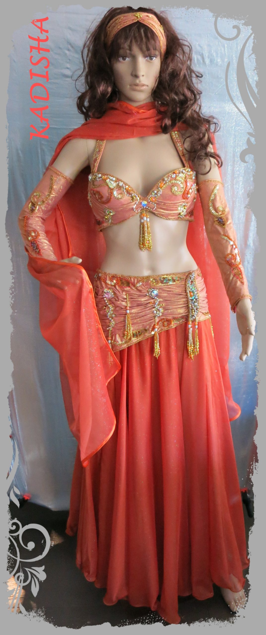 Wunderschönes Profi-Kostüm 6-tlg. mit langen, bestickten Armstulpen und Stirnband, kombiniert in den Farben apricot-orange und rost-orange, wunderschön bestickt mit Perlen, Pailletten und Straßsteinen. BH und Gürtel sind aus Holo-Lycra, der Rock ist aus Glitzer-Chiffon mit passendem Schleier. Ungewöhnlich ist der Gürtel, der wie eine Schärpe genäht wurde, er ist durch den eingearbeiteten Gummi dehnbar und sitzt super. Er wird mit großen Haken geschlossen.