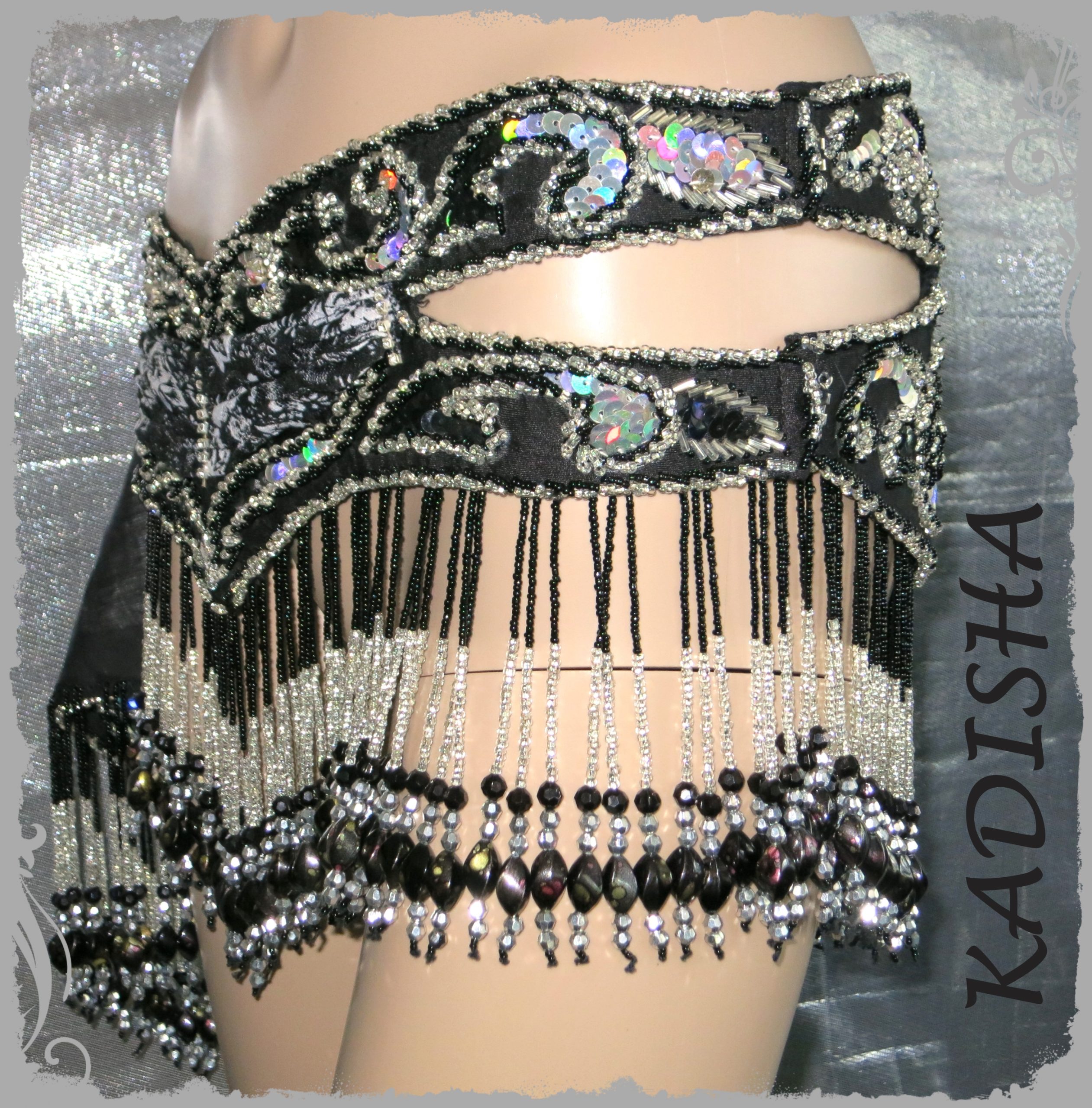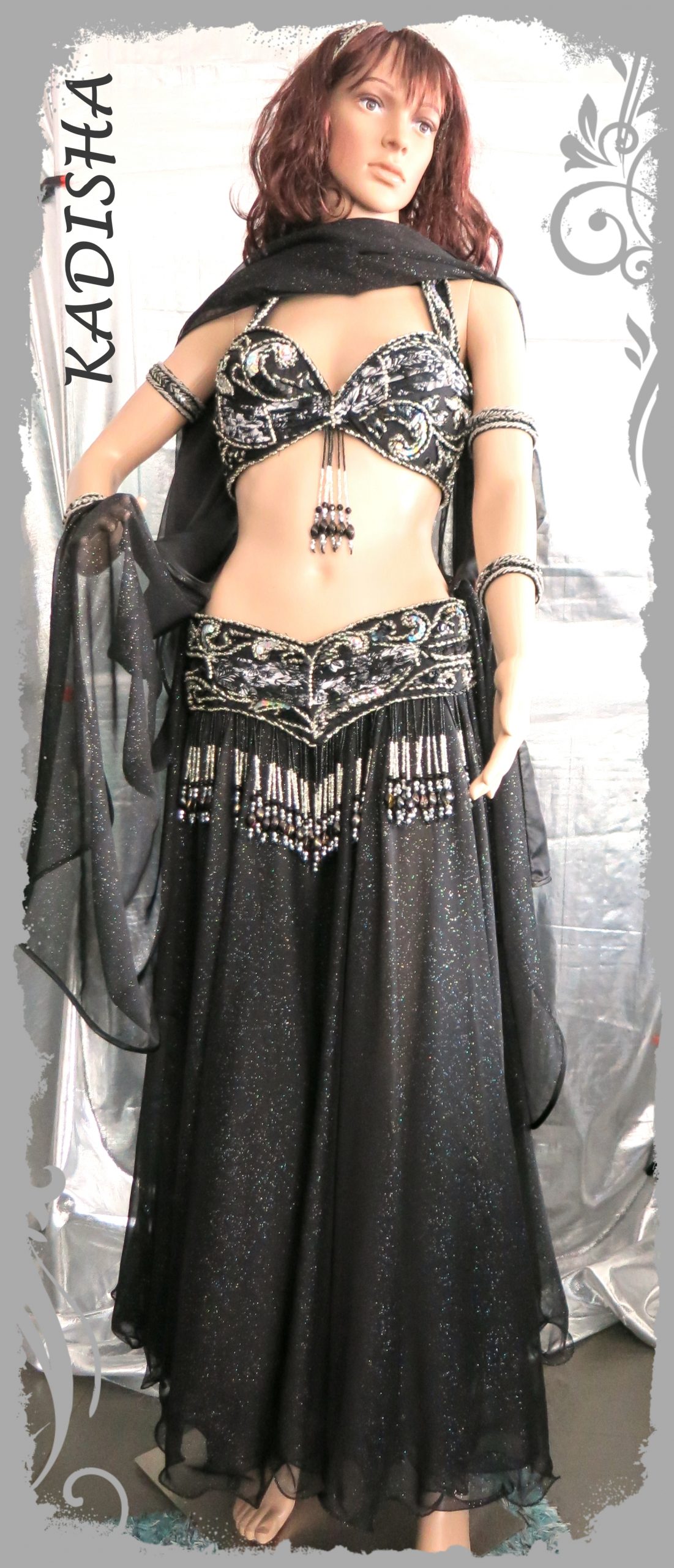 BH und Gürtel, sowie die Armschmuck in schwarz sind im wunderschönen Muster bestickt mit Perlen, Pailletten und Straßsteinen. Dazu passend der weite Rock in Glitzer-Chiffon mit Wellsaum und Schleier mit farbiger Borte.