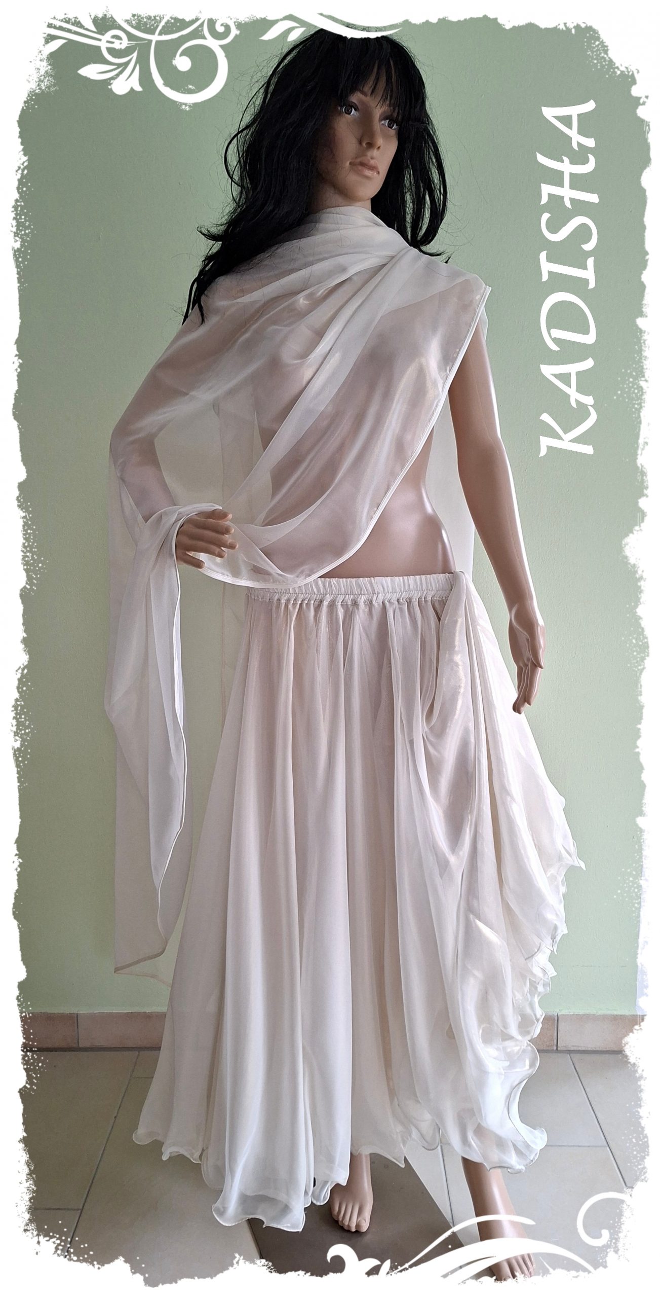 Der Rock aus Chiffon in creme ist 2-lagig und gelackt. Der schimmernde Goldglanz auf der Oberfläche dieses Stoffes ist umwerfend! Er ist weit schwingend und mit Silk rolliert für einen schönen Wellsaum. Passend dazu der Schleier mit cremefarbener Borte. Rock und Schleier passen trotz Goldschimmer wunderbar sowohl zu silber -oder gold bestickten Sachen.