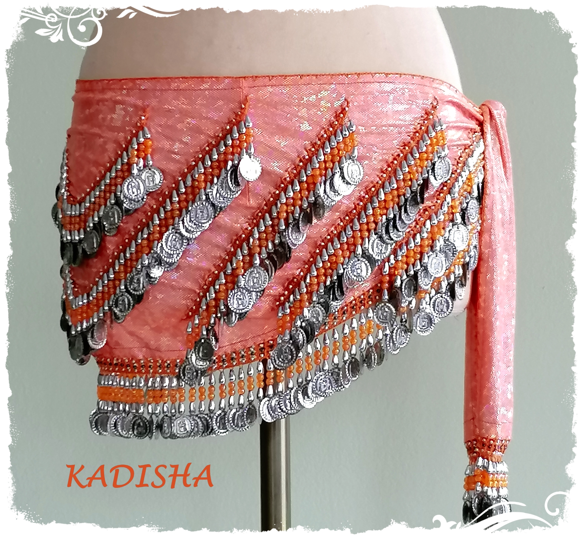 Ein glänzendes Hüfttuch aus Holo-Lycra in der Farbe „orange“. Das Hüfttuch ist im Zackenmuster behäkelt, gemixt mit silbernen und orangen Perlen, sowie silbernen Münzen.