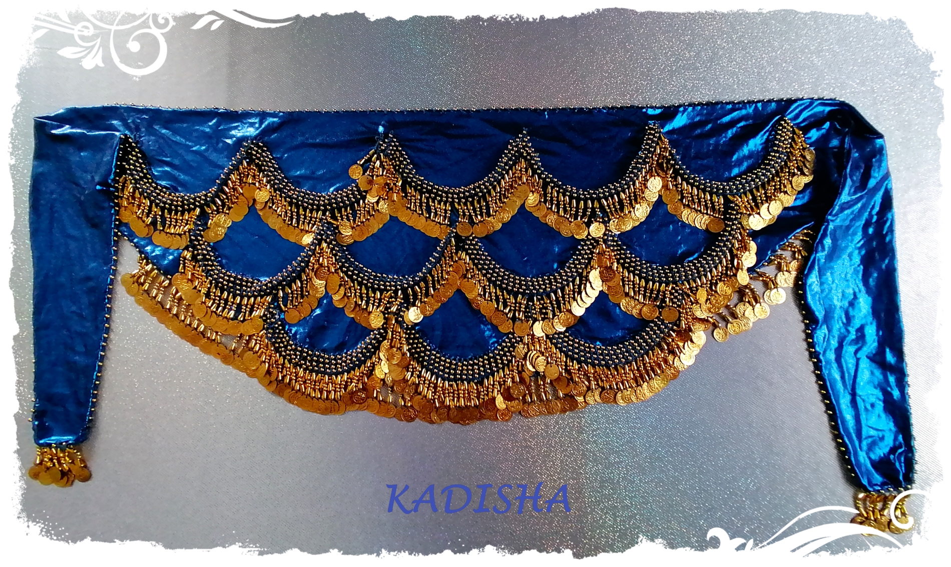 Hochglänzendes Hüfttuch in royalblau mit goldenen Perlen und goldenen Münzen behäkelt.