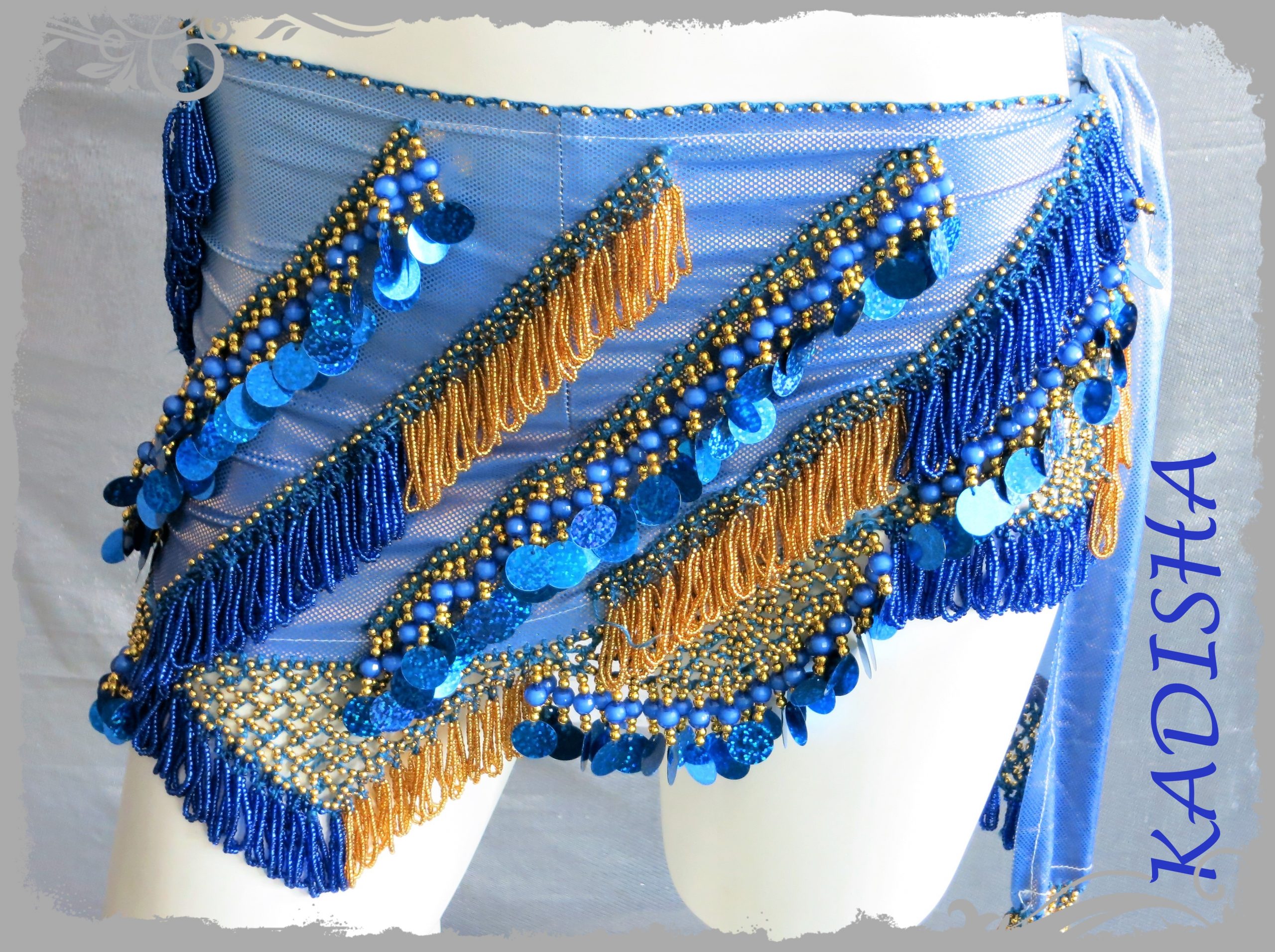 Schimmerndes Hüfttuch in royalblau mit goldenen und royalblauen Perlen sowie Holoplättchen behäkelt.