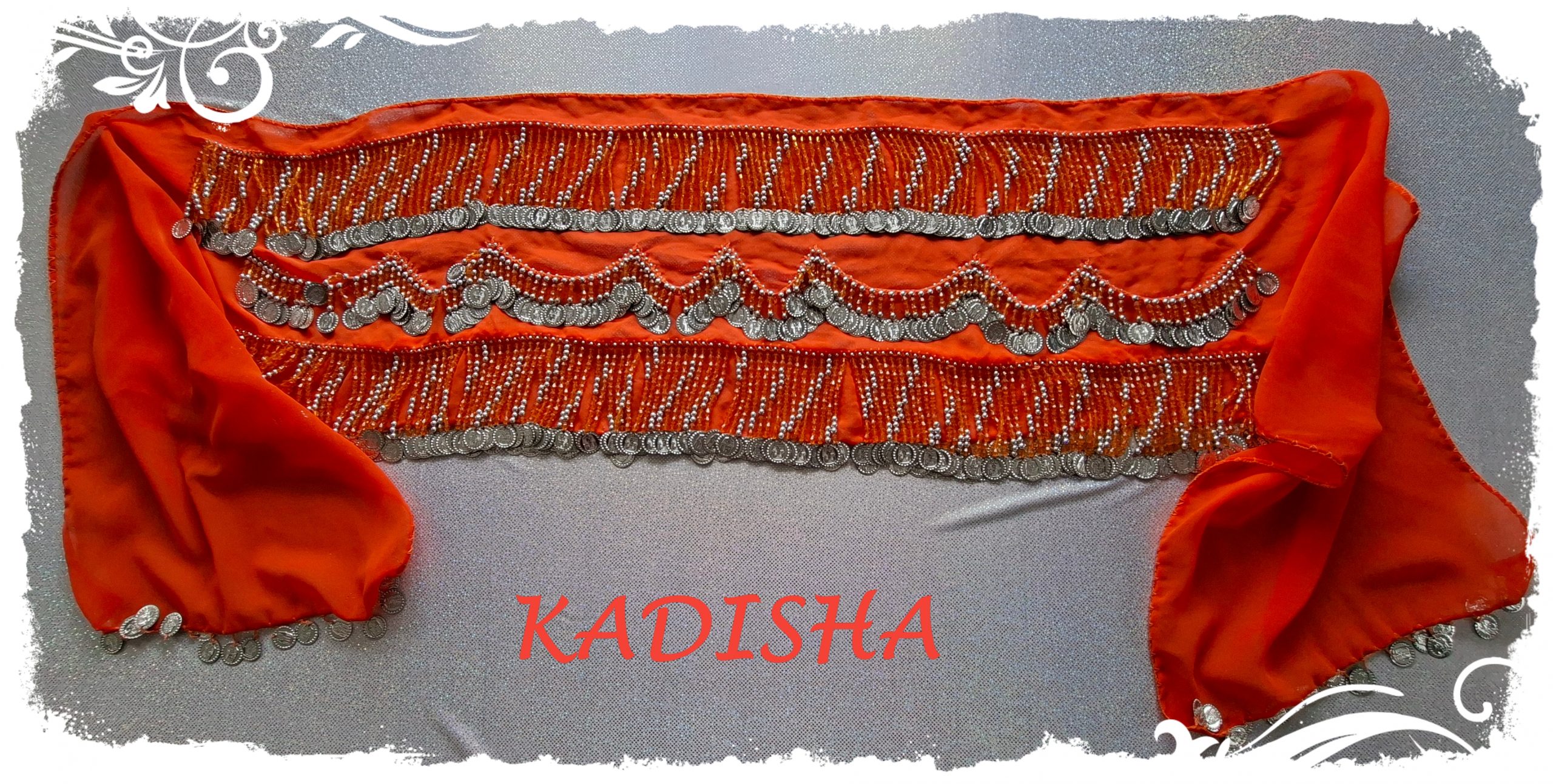 Chiffonschal in orange mit silbernen Münzen. Mit silbernen und orangen Perlen ist ein schönes Muster eingearbeitet.