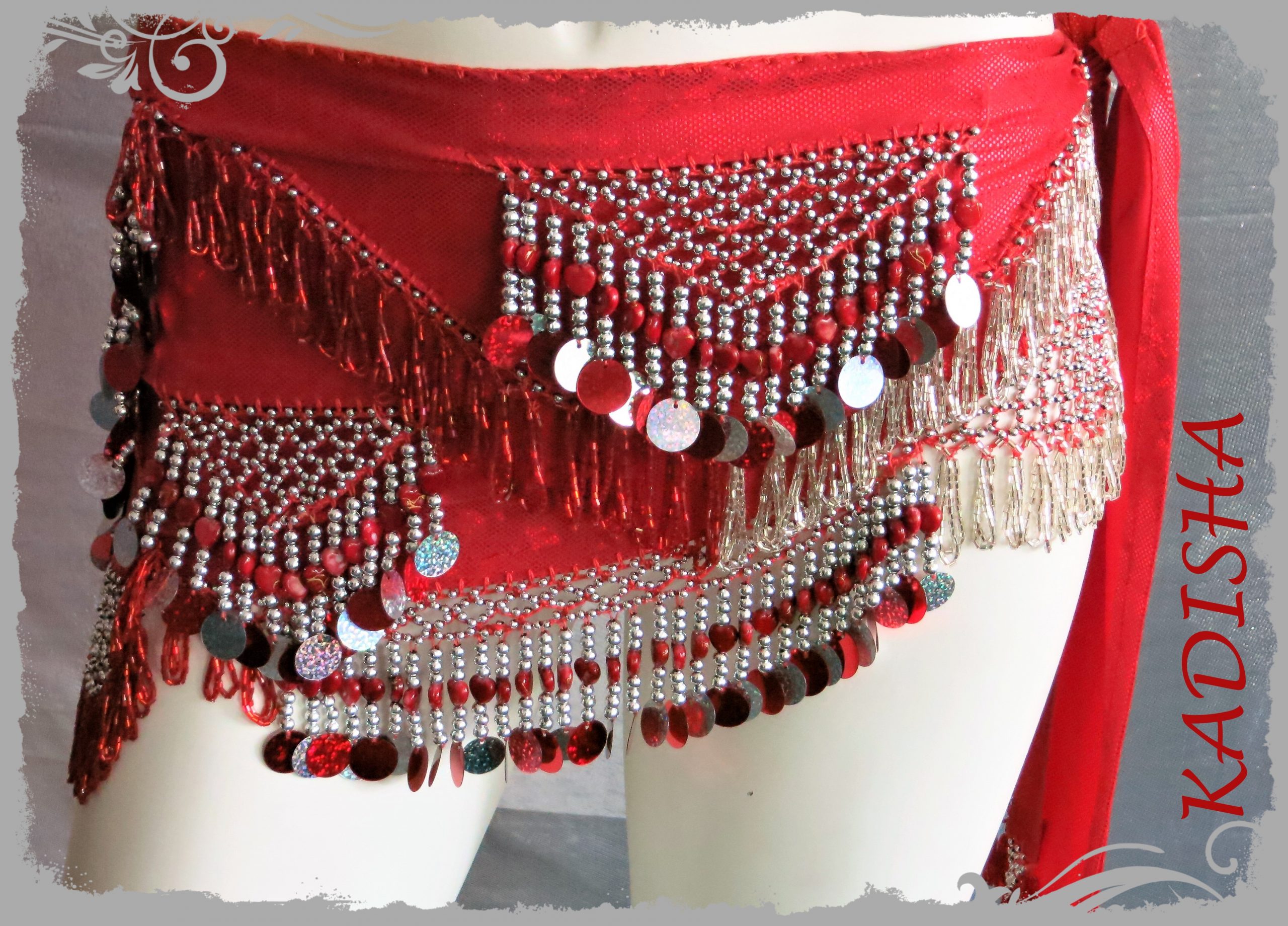 Hüfttuch aus Holo-Lycra in rot mit silbernen, sowie roten Perlen und Holoplättchen gehäkelt und gefädelt.