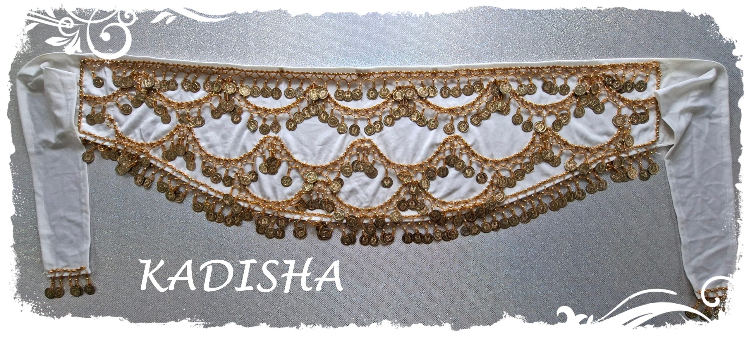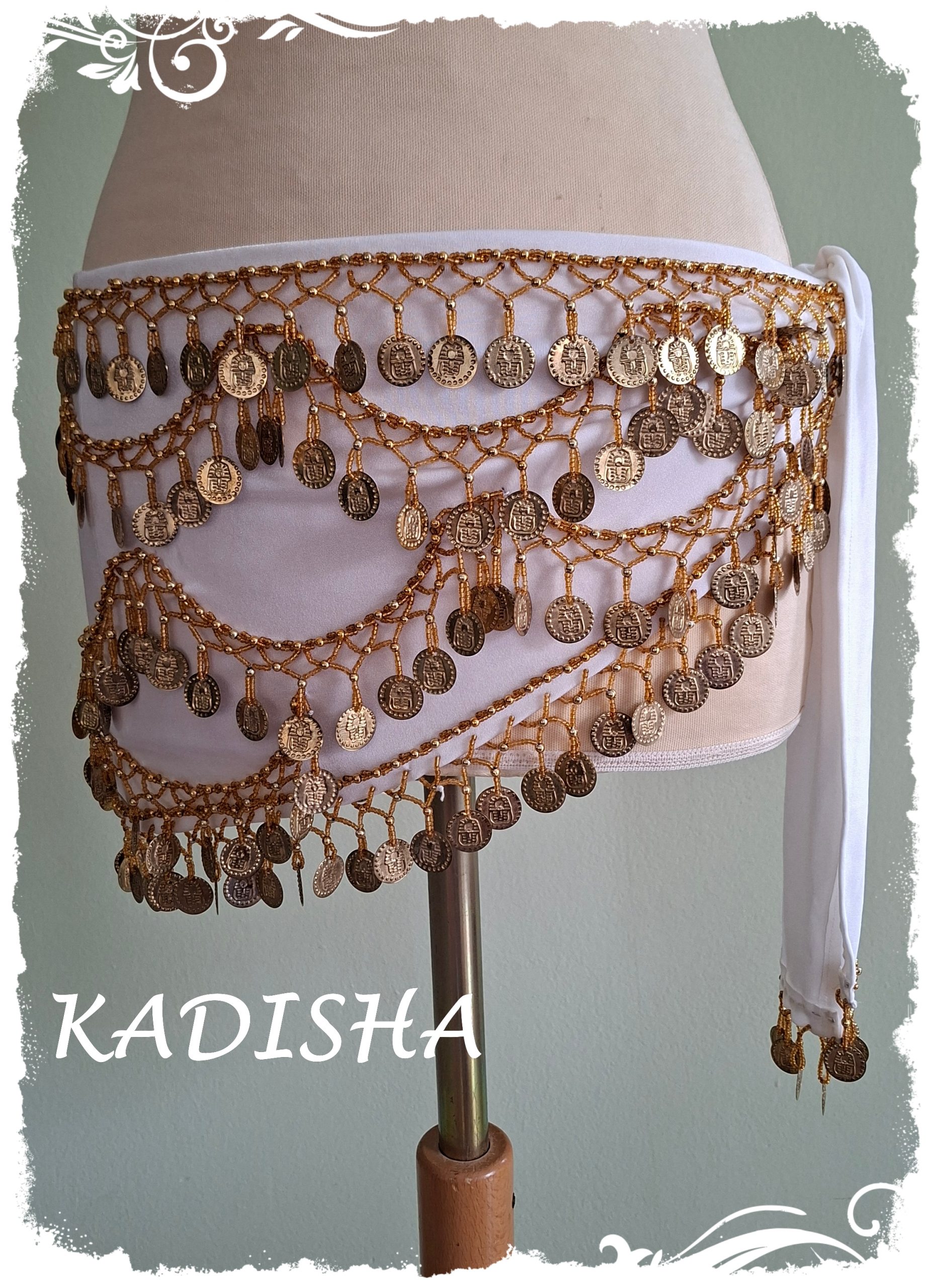 Ein wunderschön gearbeitetes Hüfttuch aus Lycra in weiß mit goldenen Münzen und goldenen Perlen.