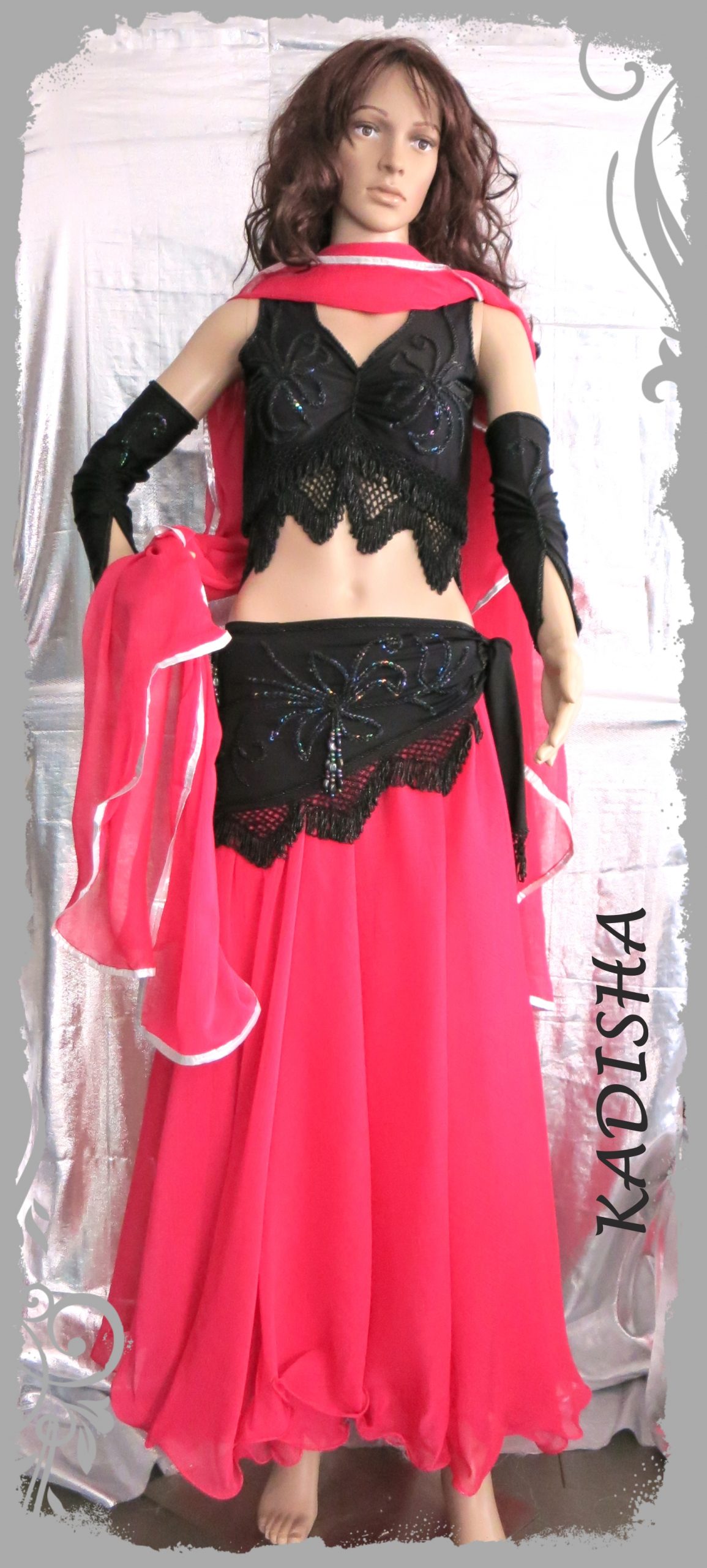 Kombination in schwarz mit erdbeer farbigen Rock und Schleier. Das ärmellose Set in schwarz ist Farbe in Farbe mit irisierenden Pailletten und schwarzen Perlen bestickt.