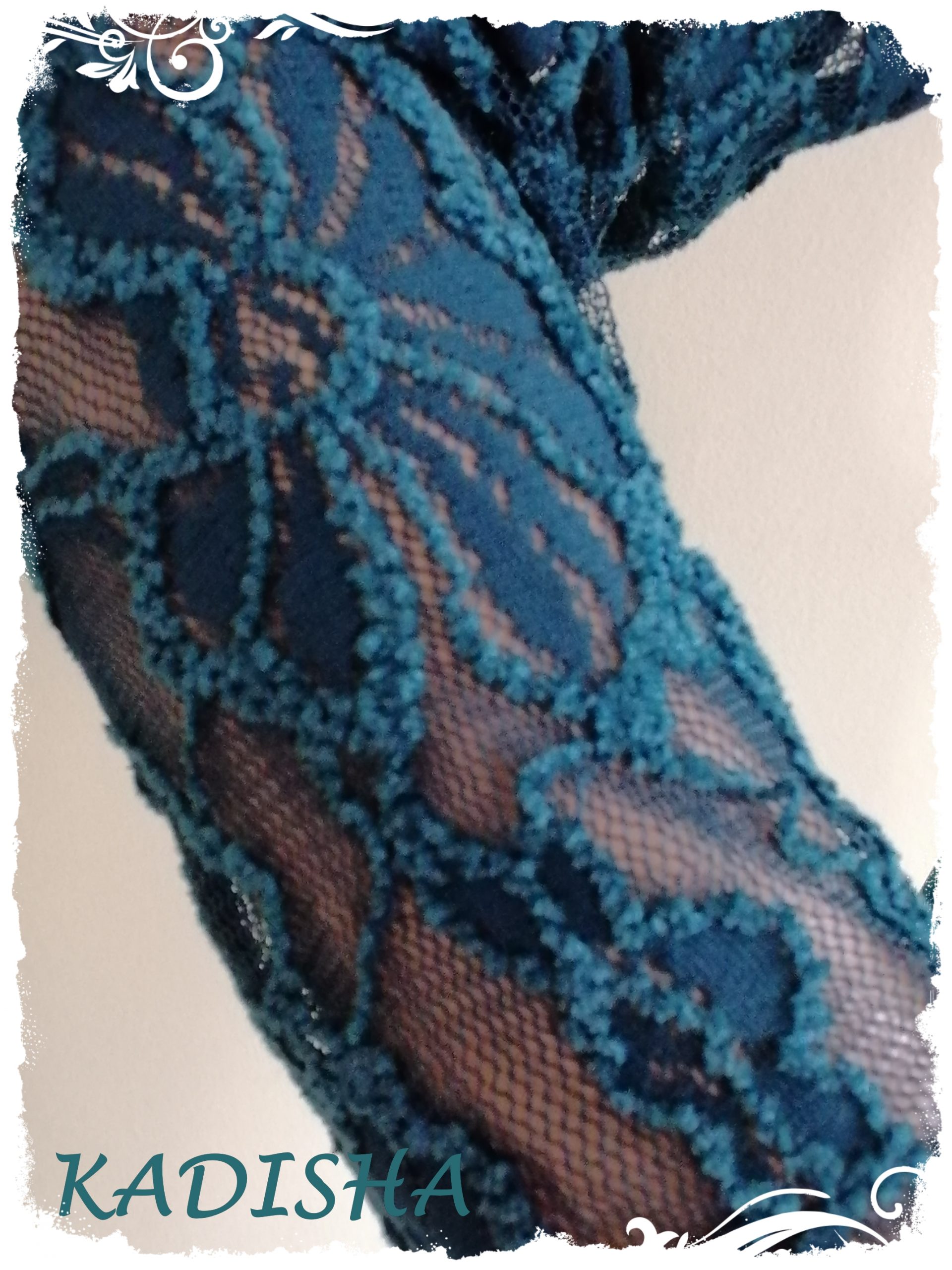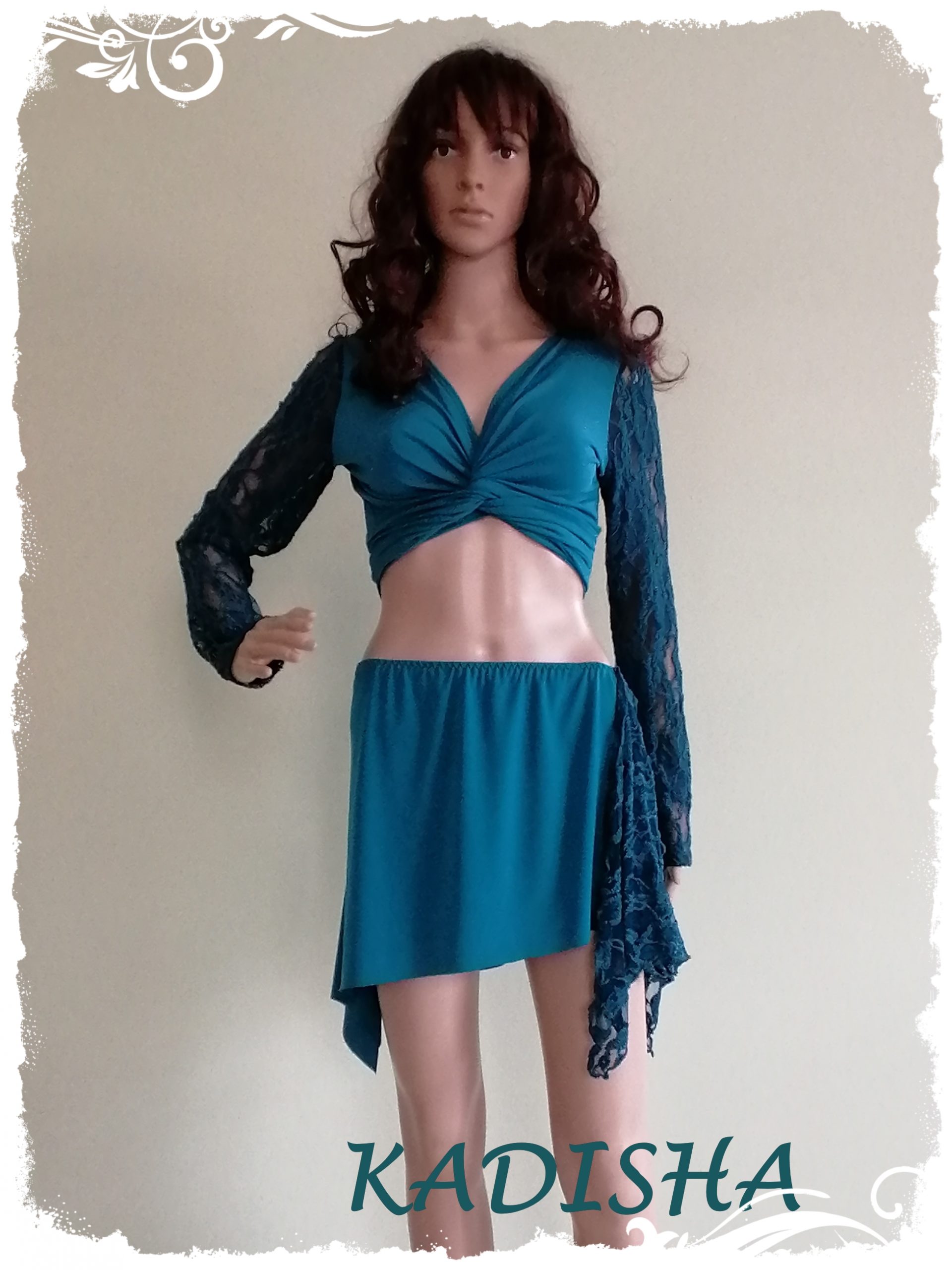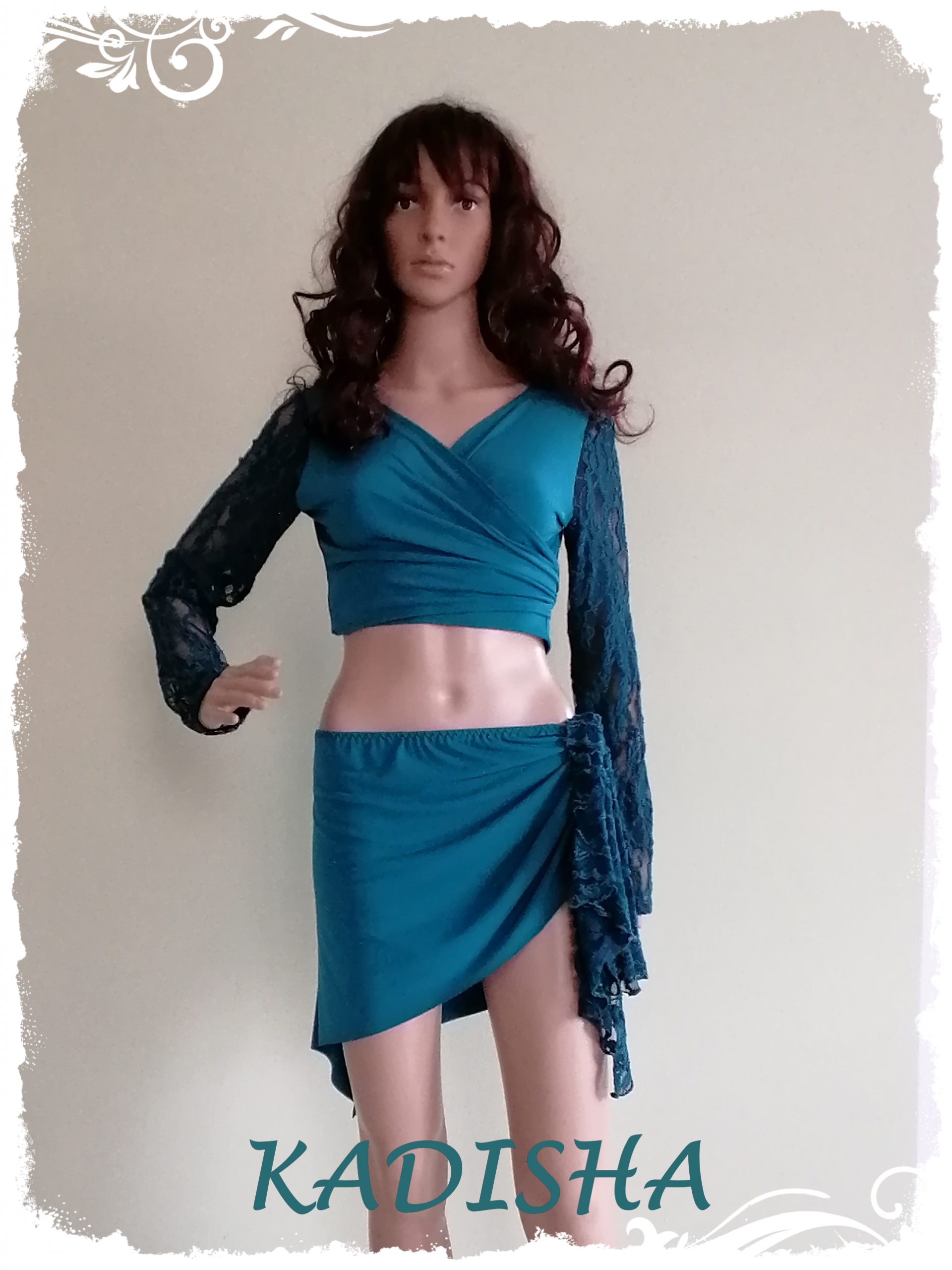 Diese Kombi aus Wickeltop und Hüftschmeichler in petrol ist sehr angenehm auf der Haut. Das Wickeltop hat lange Ärmel aus einer wunderschönen Spitze.