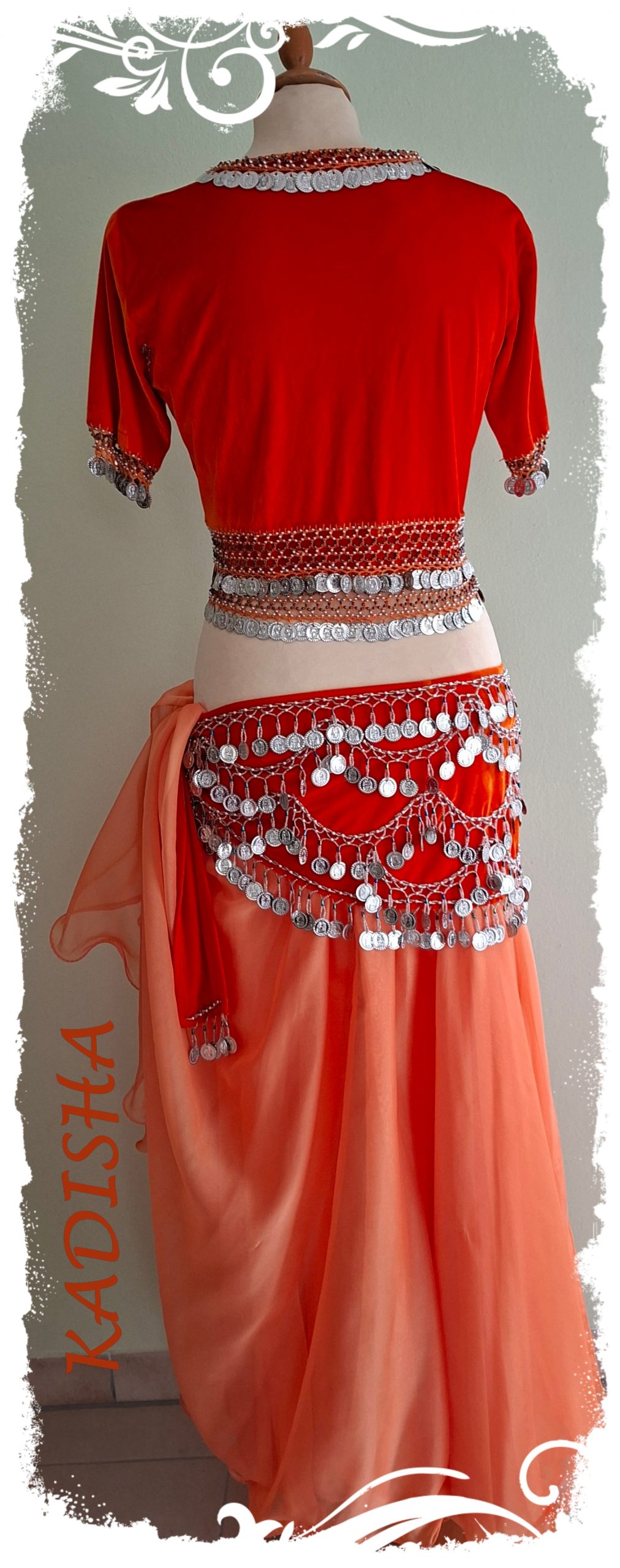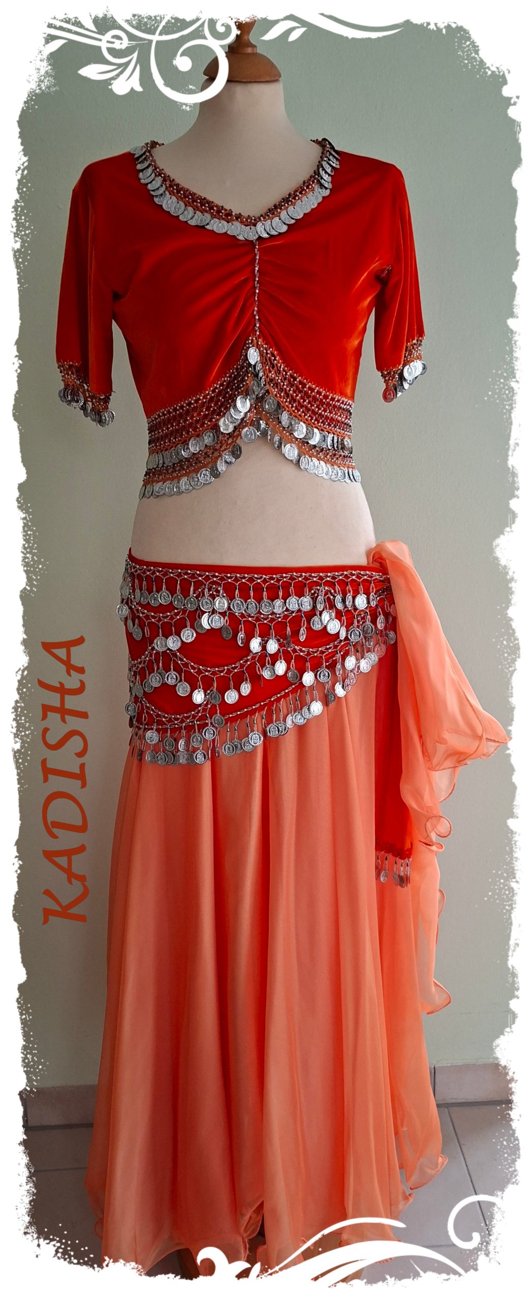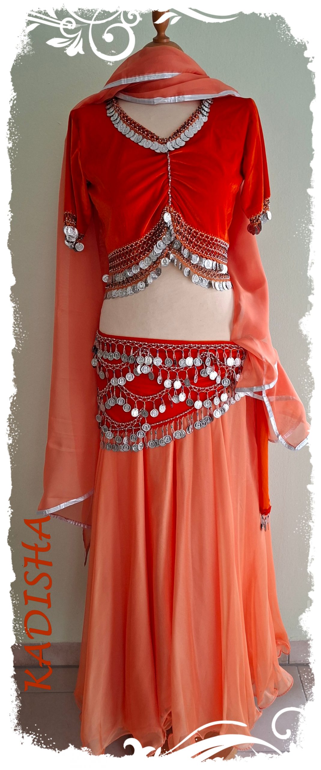 Der Rock aus Pearl-Chiffon in zartem orange ist 2-lagig, weit schwingend und mit Silk rolliert für einen schönen Wellsaum. Links und rechts sind beide Lagen offen! Passend dazu der orange farbige Schleier mit Silberborte.