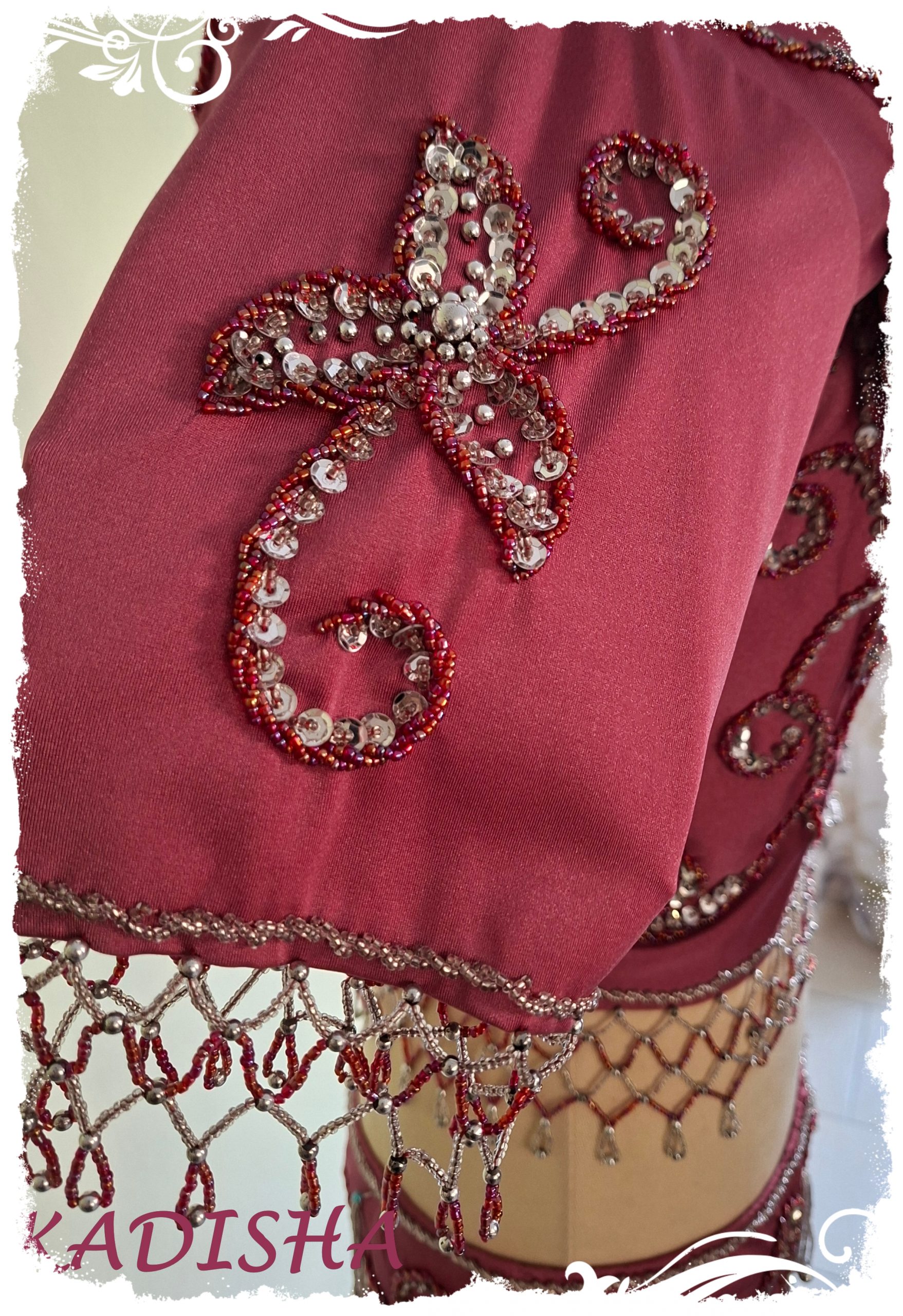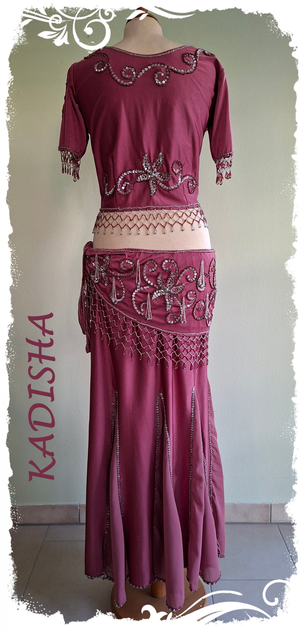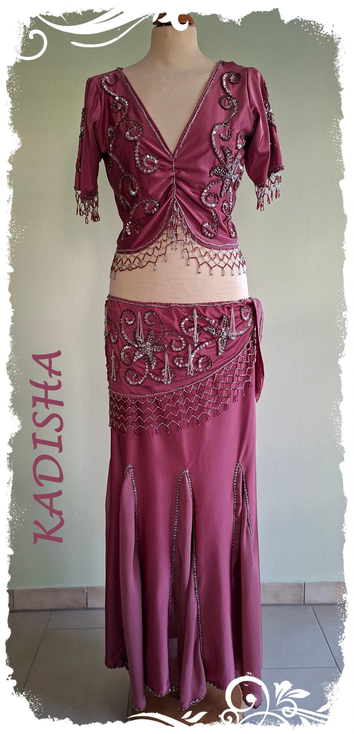 Ein wunderschöner 3-Teiler mit Godetrock in „altrose“, bestickt mit silbernen und rosefarbenen Perlen sowie silbernen Pailletten. Das individuelle Stickmuster wiederholt sich beim Top sowohl auf Vorder- und Rückseite, am Ärmel, als auch auf dem Hüfttuch. Der Schnitt ist so gearbeitet, dass er für die kleine- bis große Oberweite geeignet ist.