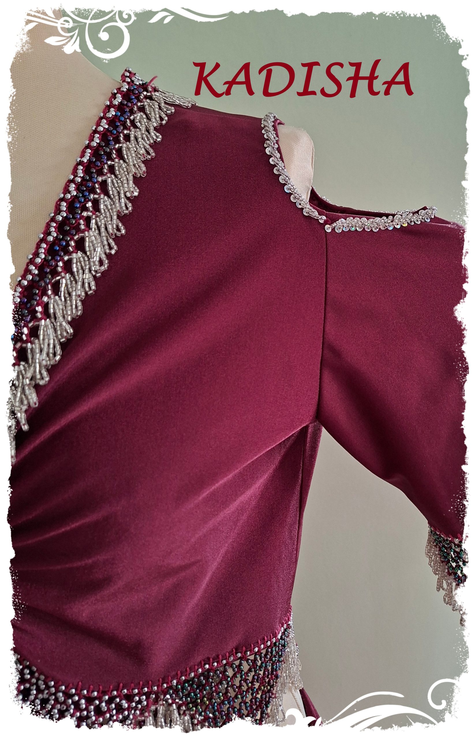 Das Oberteil ist mit silbernen Perlen bestickt und hat 2 Reihen Perlenborten. Hingucker sind die Ärmel mit Öffnungen an den Schultern. Es ist super bequem – durch den eingezogenen Unterbrustgummi kann das Top nicht hoch rutschen und sitzt perfekt bei kleiner bis großer Oberweite.