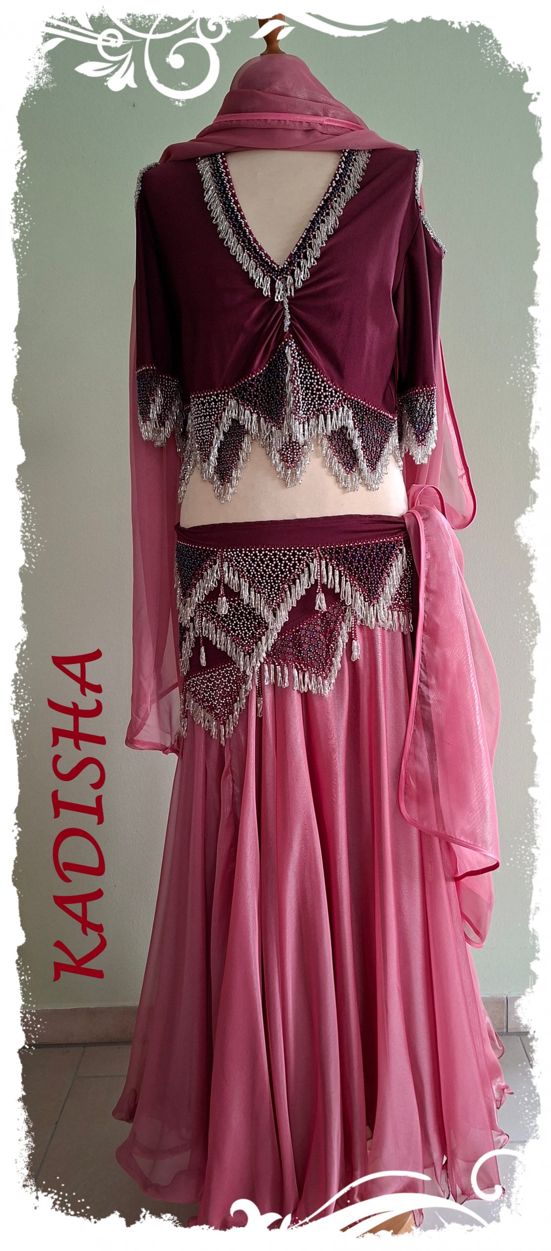 Kombination 4-tlg. in bordeaux mit altrose, Oberteil mit Kurzarm und Hüfttuch in bordeaux mit silbernen Perlen, dazu ein Glanzrock mit Schleier in altrose, Größe XL