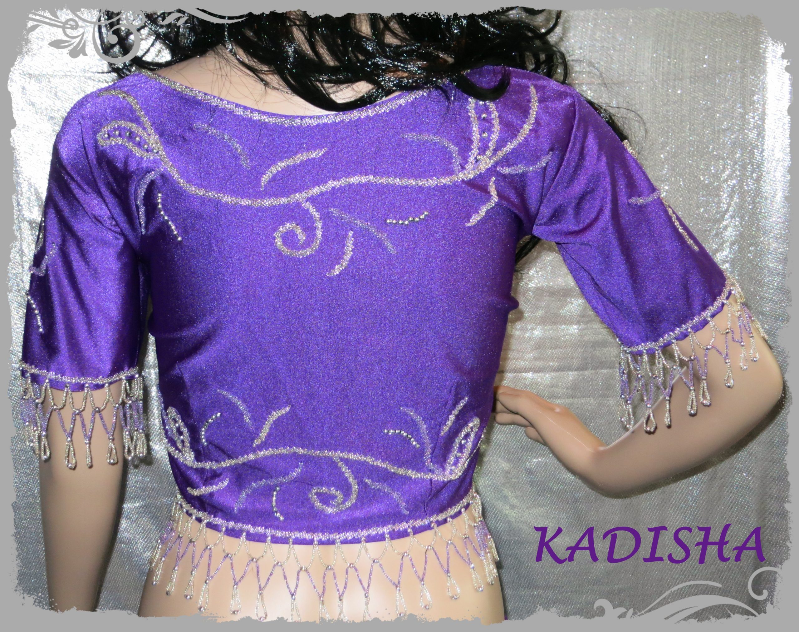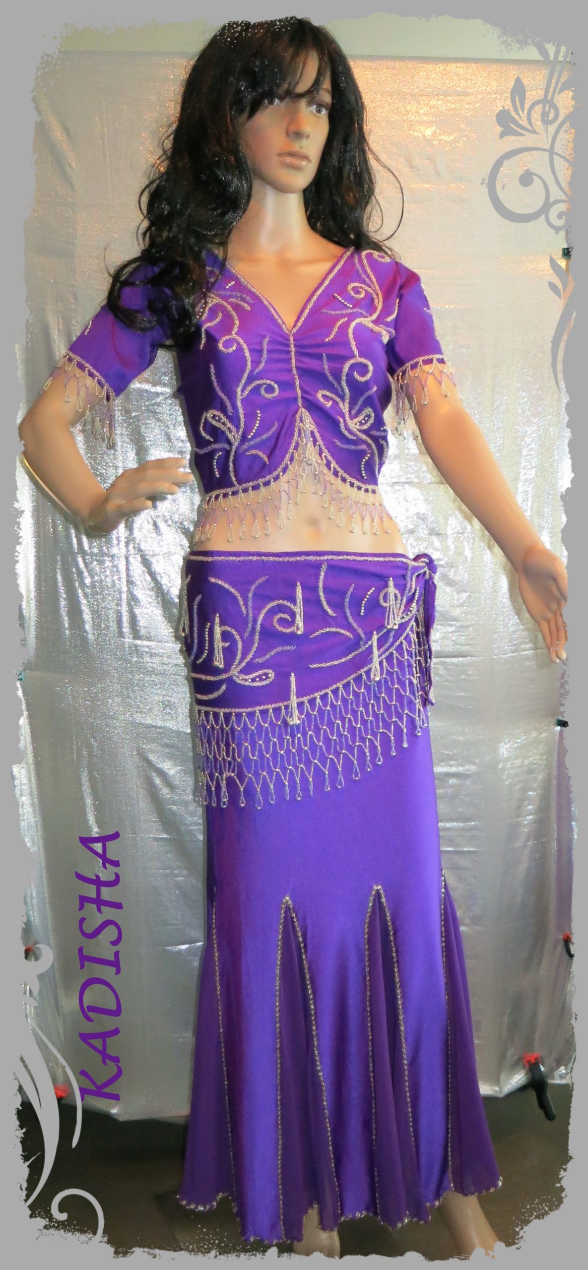 Ein wunderschöner 3-Teiler mit Godetrock in lila, bestickt mit silbernen und Flieder farbenen Perlen. Das individuelle Stickmuster wiederholt sich beim Top sowohl auf Vorder- und Rückseite, am Ärmel, als auch auf dem Hüfttuch. Der Schnitt ist so gearbeitet, dass er für die kleine- bis große Oberweite geeignet ist.