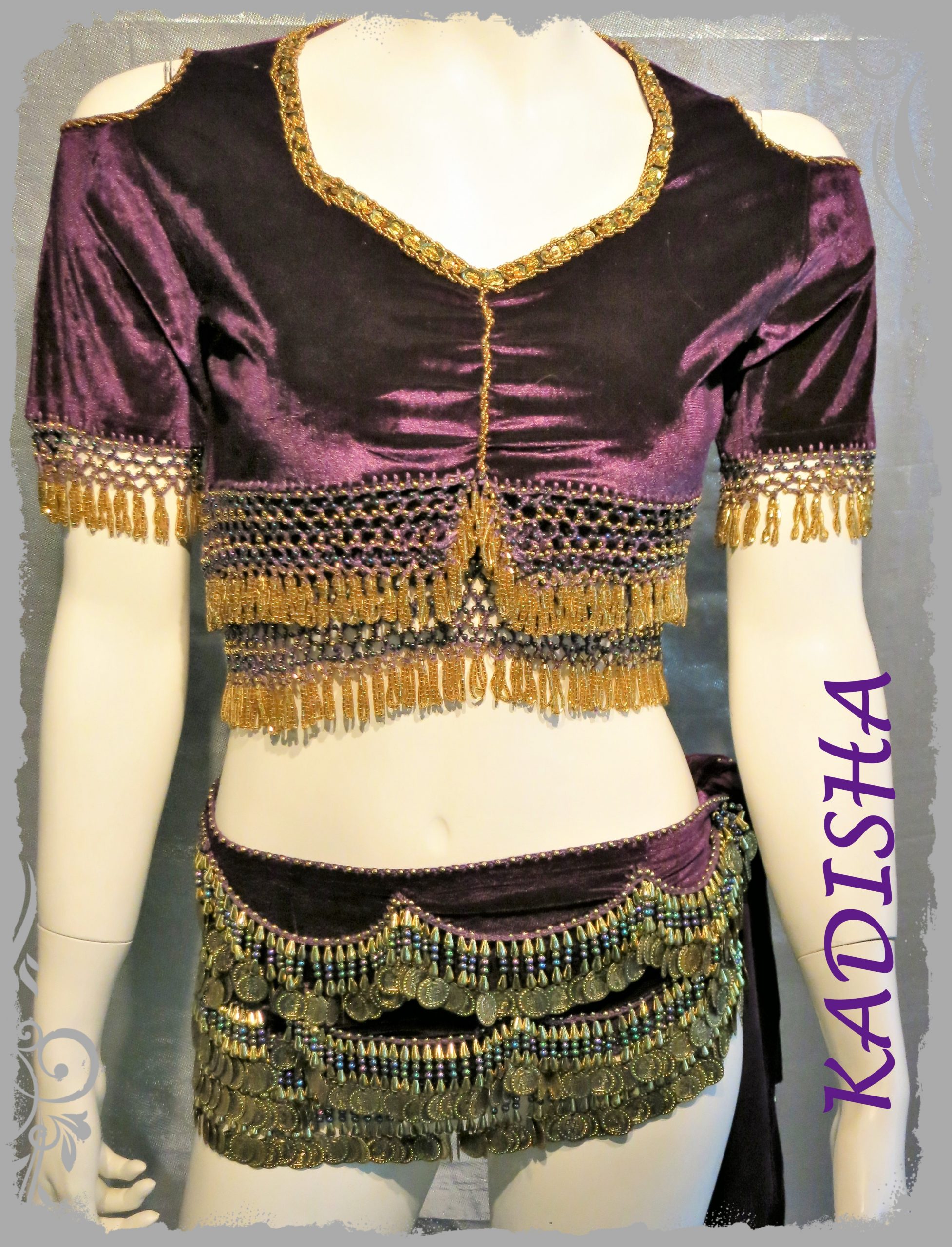 Set aus Stretchsamt in einem dunklen lila. Das Oberteil ist mit goldenen Perlen bestickt und hat 2 Reihen Perlenborten. Es ist super bequem – durch den eingezogenen Unterbrustgummi kann das Top nicht hoch rutschen und sitzt perfekt bei kleiner bis großer Oberweite.