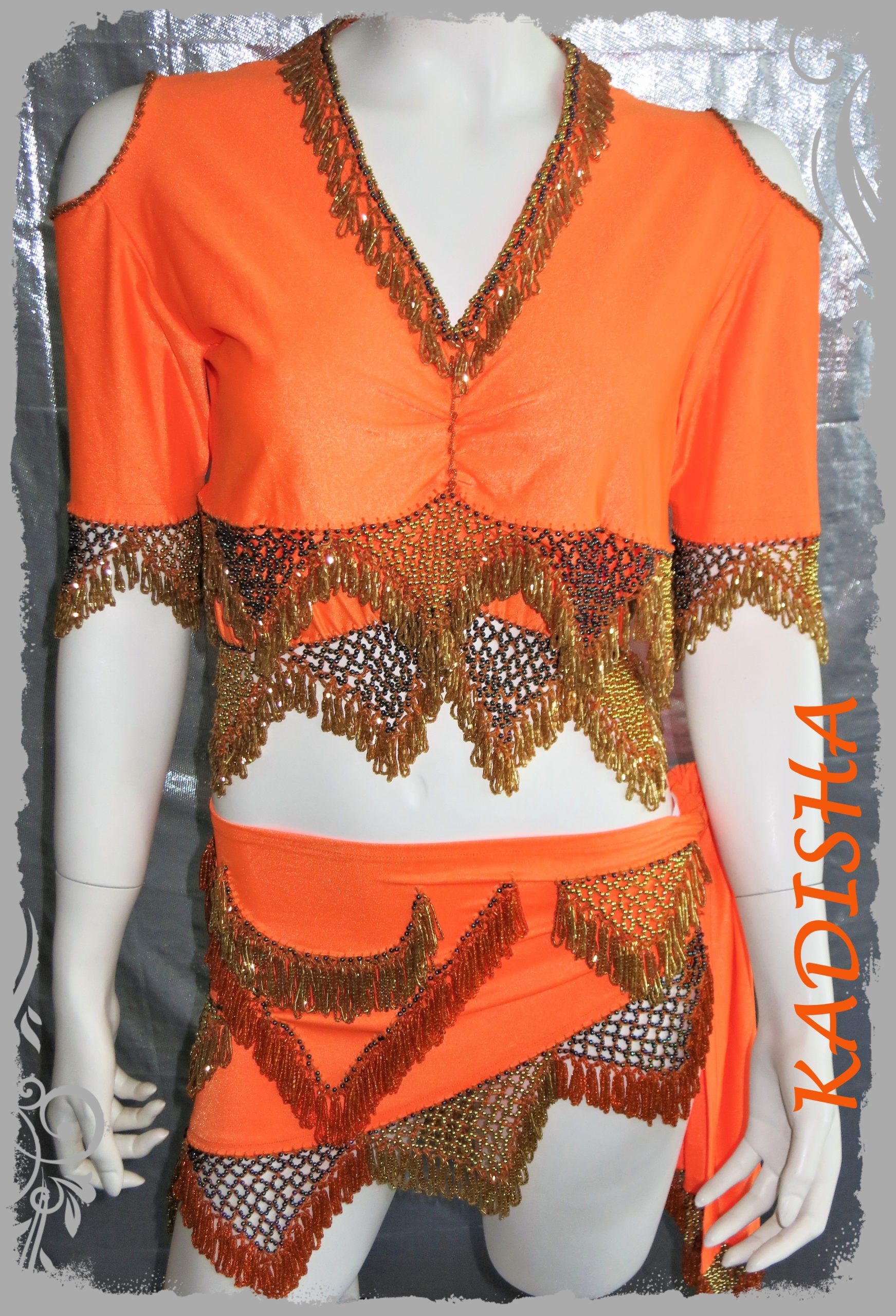 Set in der leuchtenden Farbe „neonorange“. Das Oberteil ist mit goldenen Perlen bestickt und hat 2 Reihen Perlenborten. Hingucker sind die Ärmel mit Öffnungen an den Schultern. Es ist super bequem – durch den eingezogenen Unterbrustgummi kann das Top nicht hoch rutschen und sitzt perfekt bei kleiner bis großer Oberweite.