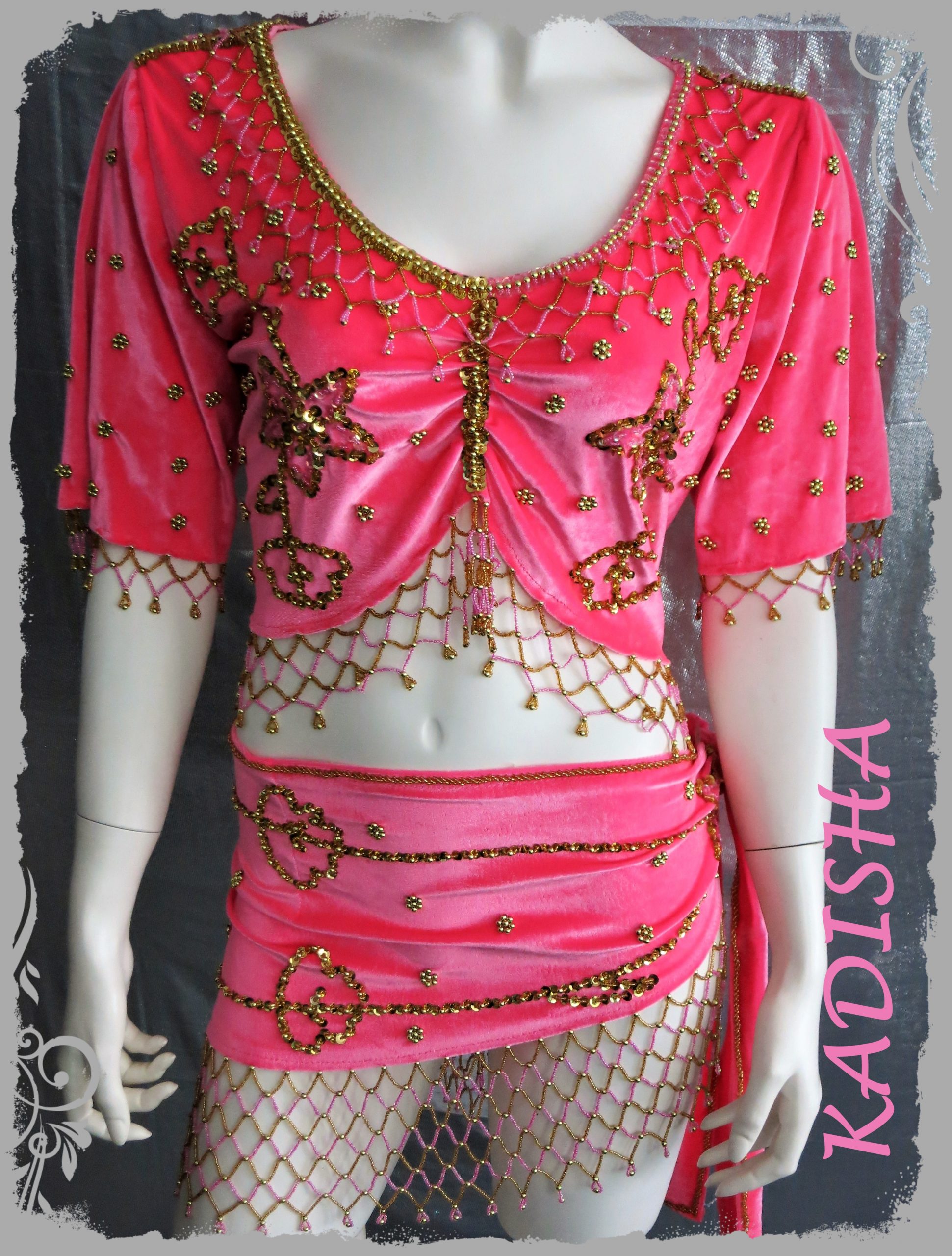 Ein schönes Set aus Stretchsamt in „neonpink“, bestickt mit silbernen und pinkfarbenen Perlen sowie silbernen Pailletten. Das individuelle Stickmuster wiederholt sich am Top als auch auf dem Hüfttuch. Besonders hübsch ist auch das Perlengitter am Ausschnitt. Sehr angenehmes und bequemes Set.