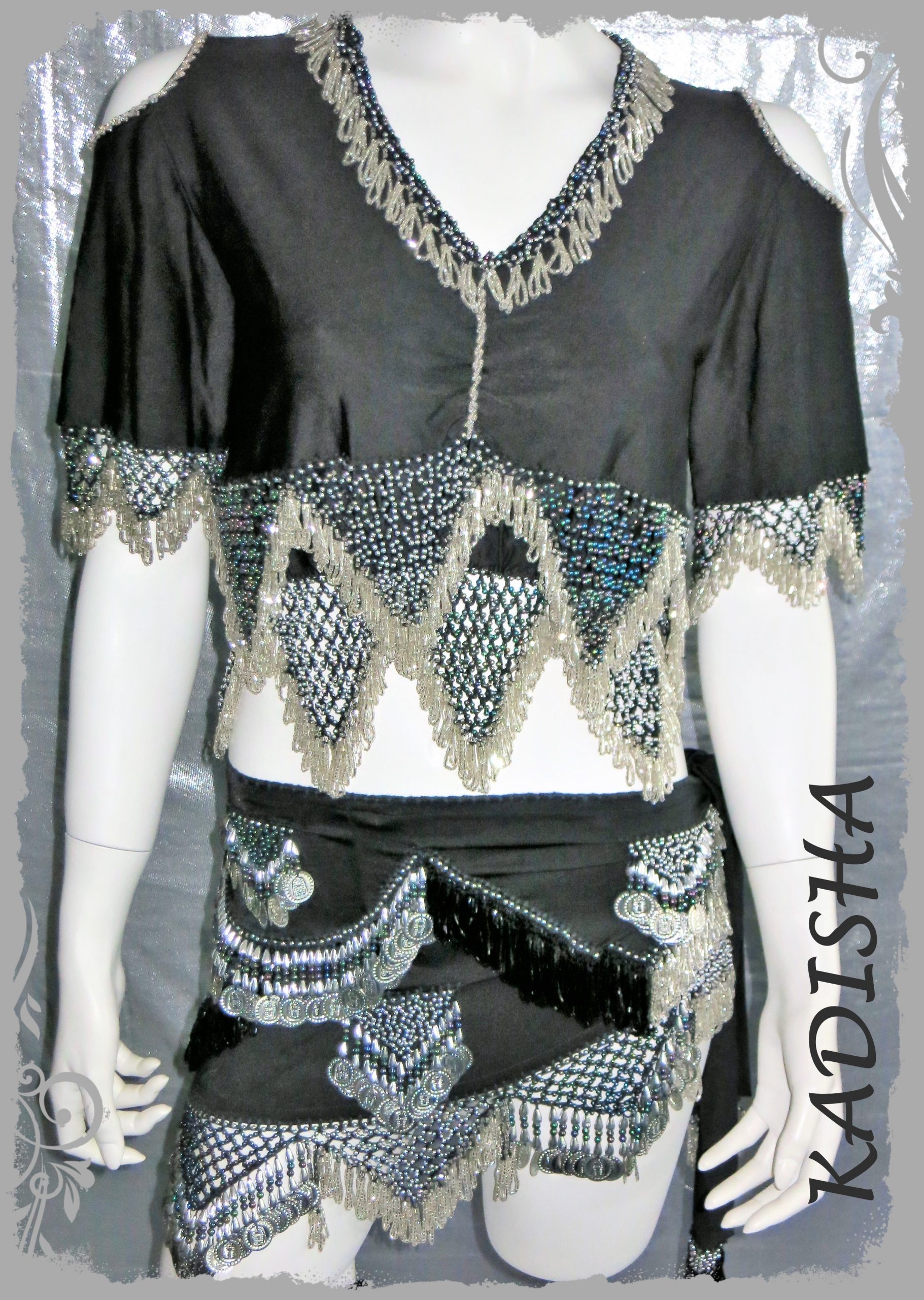 Das Oberteil ist mit silbernen Perlen bestickt und hat 2 Reihen Perlenborten. Hingucker sind die Ärmel mit Öffnungen an den Schultern. Es ist super bequem – durch den eingezogenen Unterbrustgummi kann das Top nicht hoch rutschen und sitzt perfekt bei kleiner bis großer Oberweite.