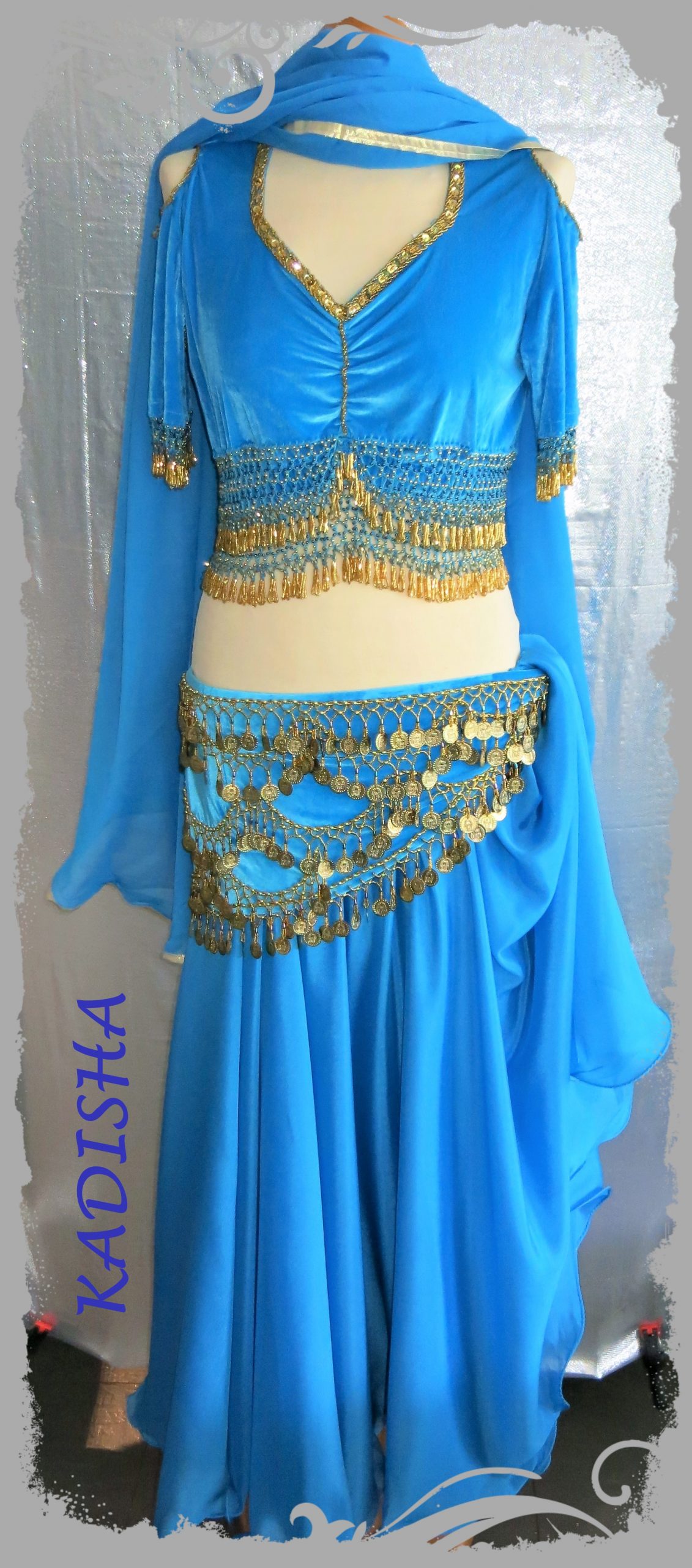 Schönes Outfit in türkis. Oberteil und Hüfttuch sind aus Stretchsamt gearbeitet. Das Oberteil ist mit goldenen Perlen und Pailetten bestickt und hat 2 Reihen Perlenborten. Es ist super bequem – durch den eingezogenen Unterbrustgummi kann das Top nicht hoch rutschen und sitzt perfekt bei kleiner bis großer Oberweite.