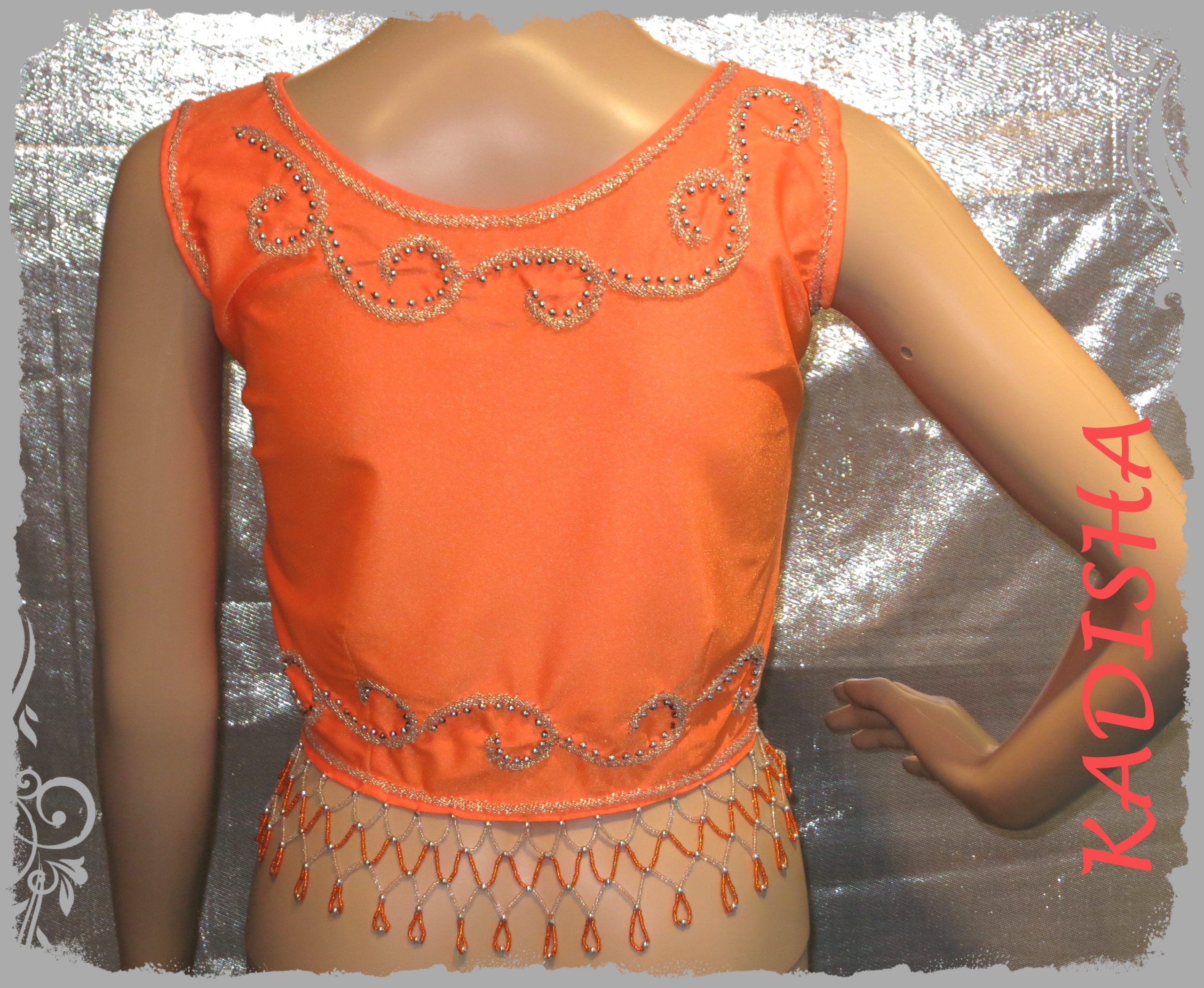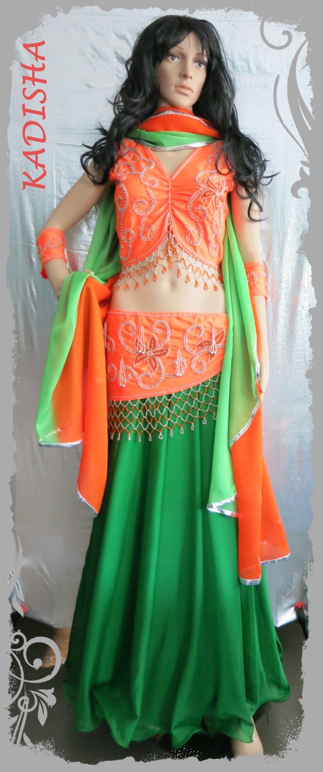 Eine wunderschöne 5-tlg. Kombi in der Neonfarbe Orange und Grün. Ärmelloses Oberteil, Armschmuck und Hüfttuch sind bestickt mit silbernen und orangen Perlen. Das individuelle Stickmuster wiederholt sich beim Top sowohl auf Vorder- und Rückseite, am Armschmuck, als auch auf dem Hüfttuch. Der Schnitt ist so gearbeitet, dass er für die kleine- bis große Oberweite geeignet ist.