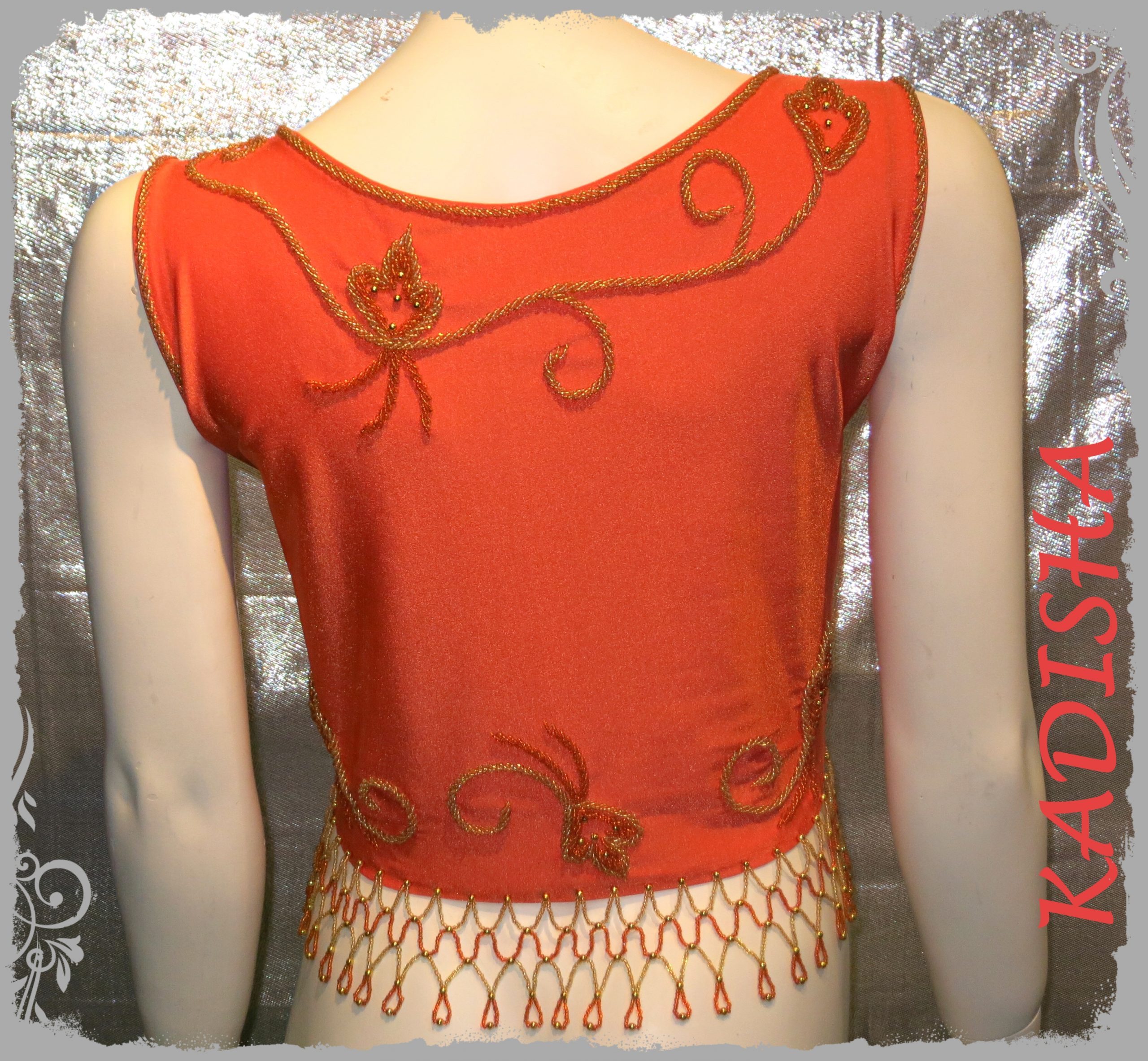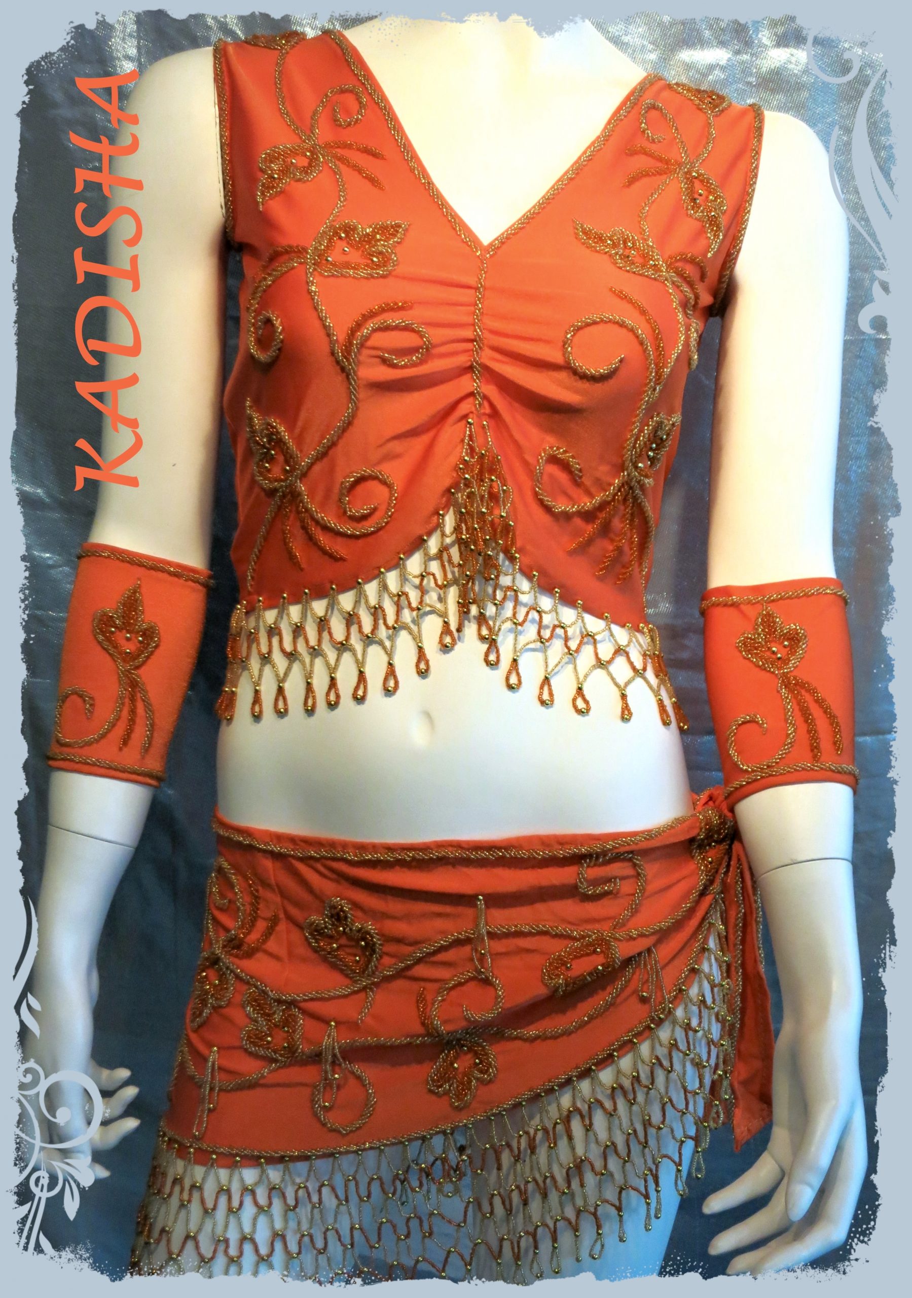 Ein wunderschönes ärmelloses Set mit Armschmuck in der Farbe „orange“, reich bestickt mit goldenen und farbigen Perlen. Das individuelle Stickmuster wiederholt sich beim Top sowohl auf Vorder- und Rückseite, als auch auf dem Hüfttuch. Der Schnitt des Oberteils ist so gearbeitet, dass er für die kleine bis große Oberweite geeignet ist.