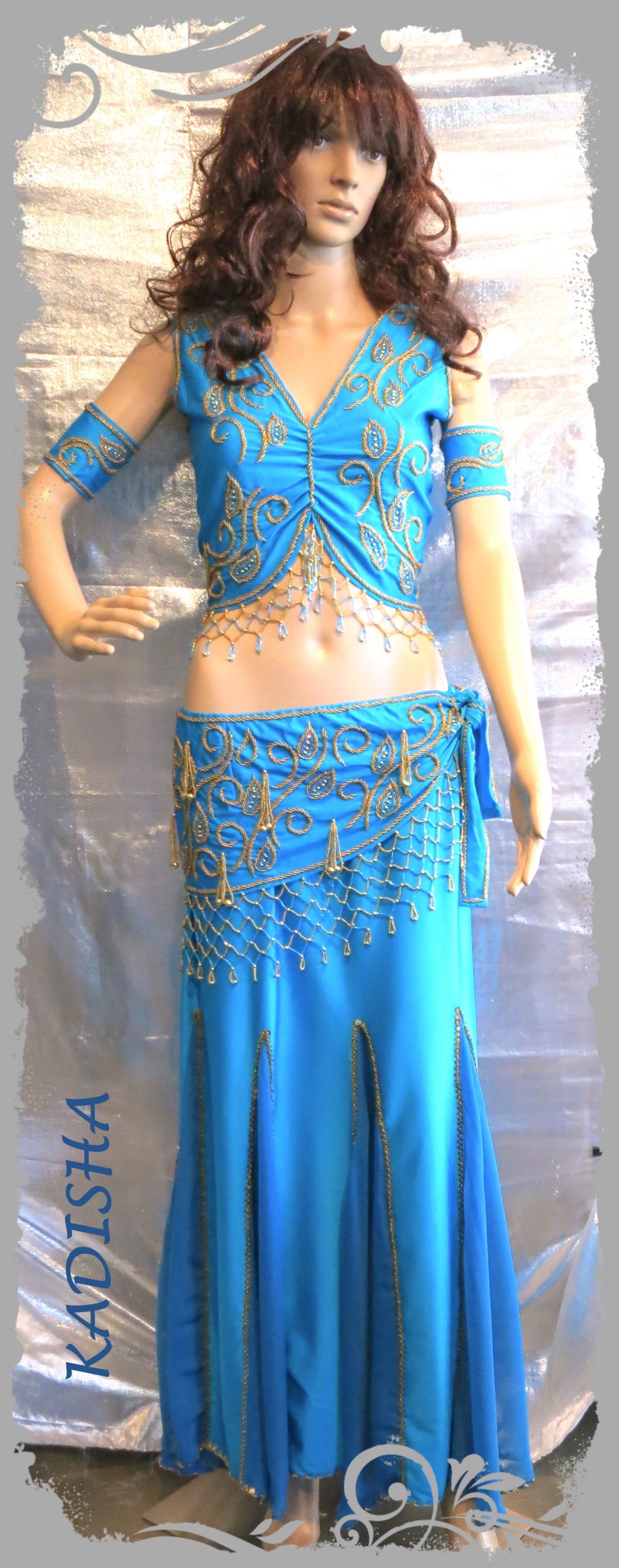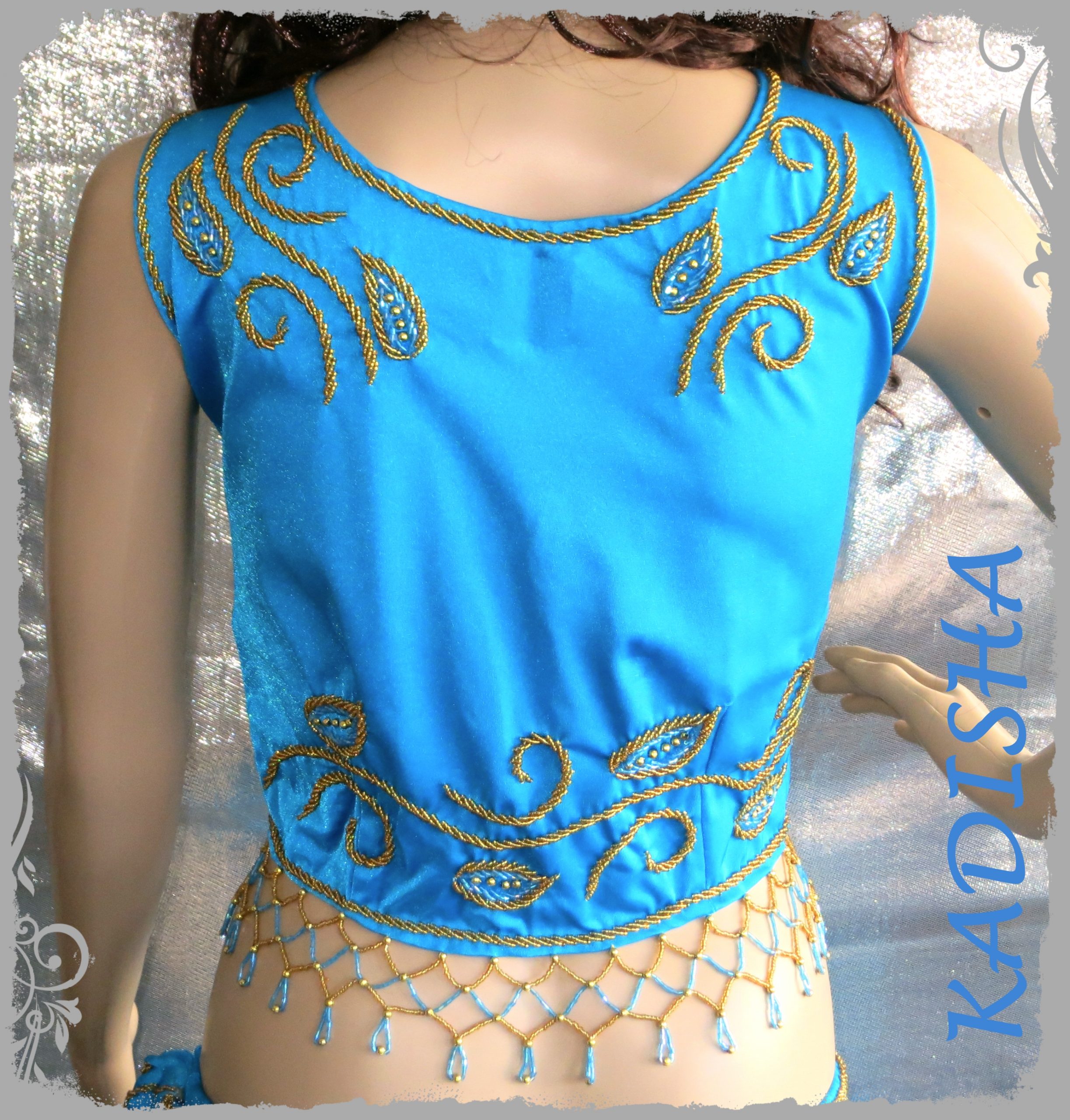Ein wunderschöner 3-Teiler mit Godetrock in türkis, bestickt mit goldenen Perlen und hellblauen irisierenden Perlen. Das individuelle Stickmuster wiederholt sich am ärmellosen Top sowohl auf Vorder- und Rückseite, am Armschmuck, als auch auf dem Hüfttuch. Der Schnitt ist so gearbeitet, dass er für die kleine- bis große Oberweite geeignet ist.