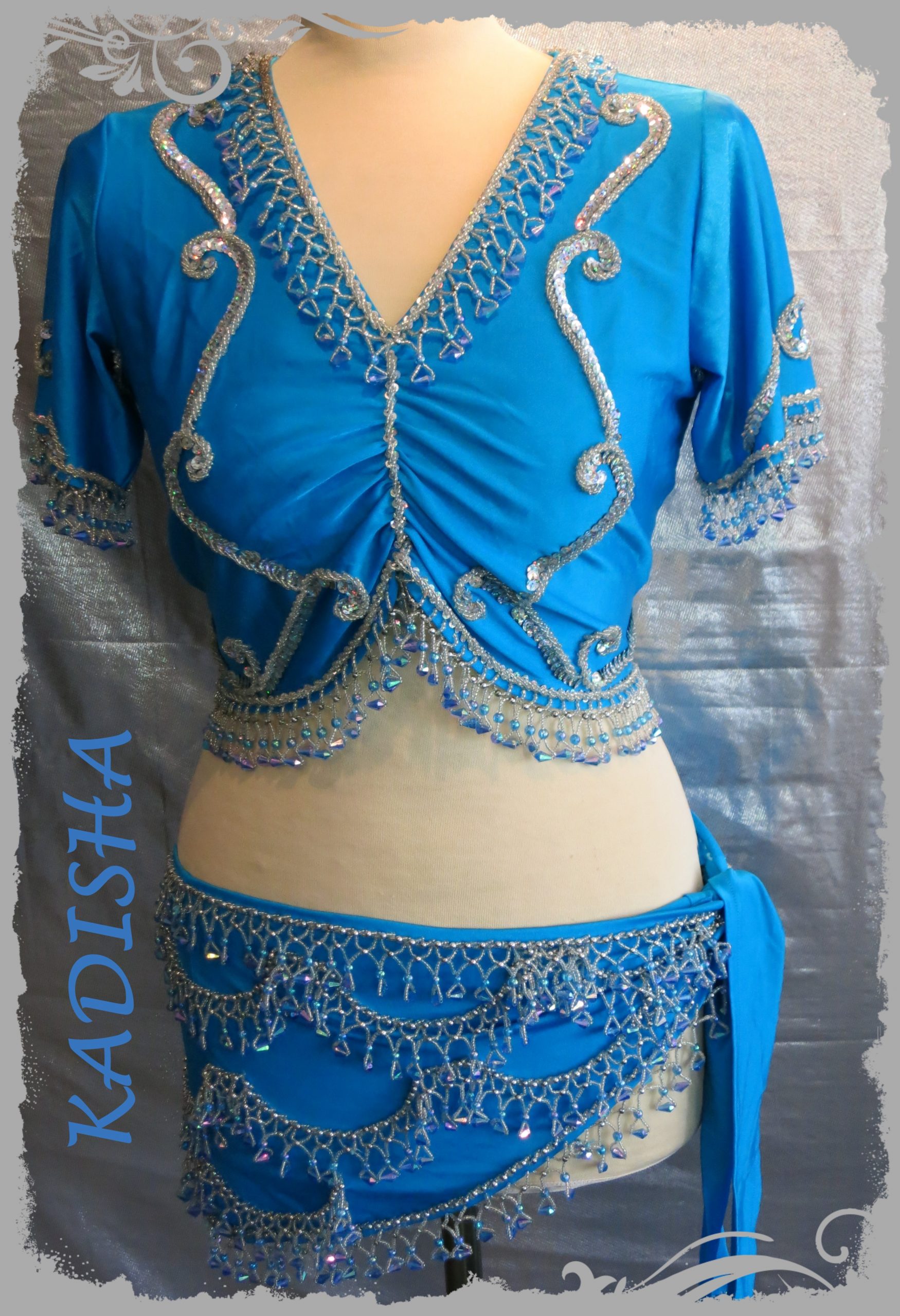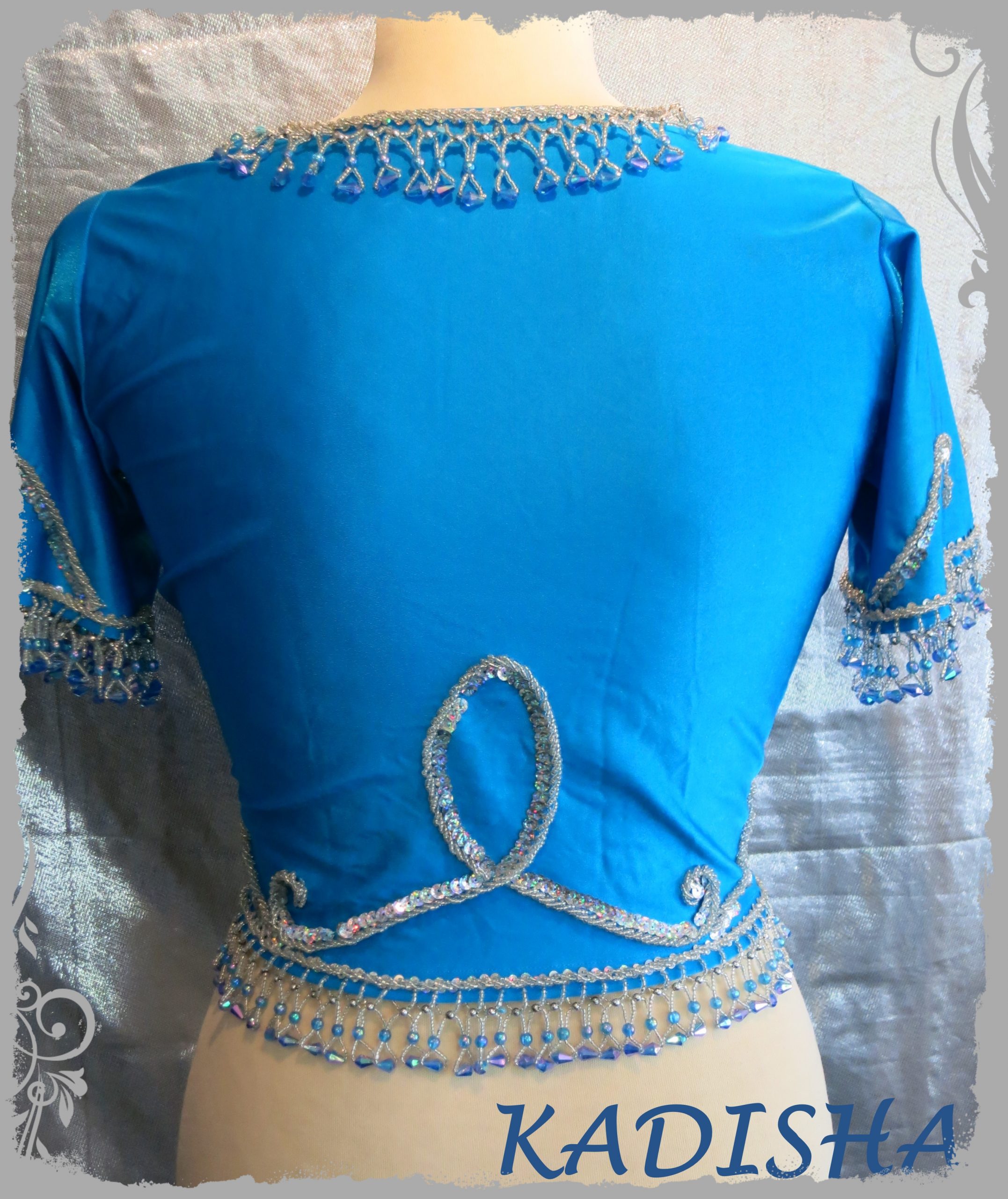 Das Set in der Farbe türkis ist mit silbernen Pailletten und farbig irisierenden Perlen bestickt.