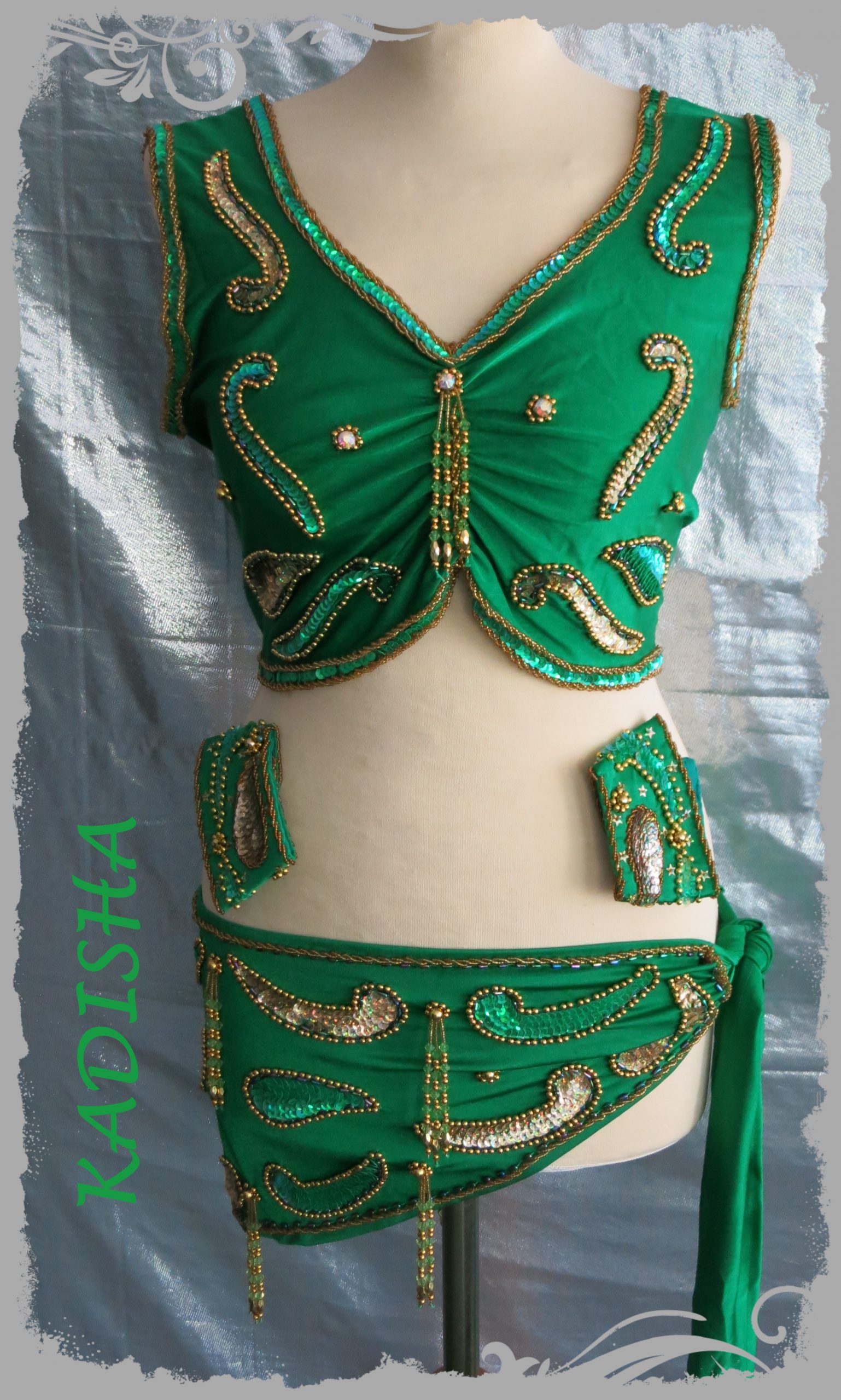 Das Set in einem schönen warmen grün ist mit goldenen und farbig irisierenden Pailletten und Perlen bestickt. Das ärmellose Oberteil in einem warmen grün hat vorne 3 Straßsteine eingearbeitet. Der Armschmuck schließt mit Klett. Am Oberteil in der Mitte, sowie am Hüfttuch baumeln Perlenbüschel. Der Schnitt des Oberteils ist für den kurzen Oberkörper und eher für den kleinen Busen geeignet. Vordere Länge ab Schulternaht (Stoff) ca. 40 cm.