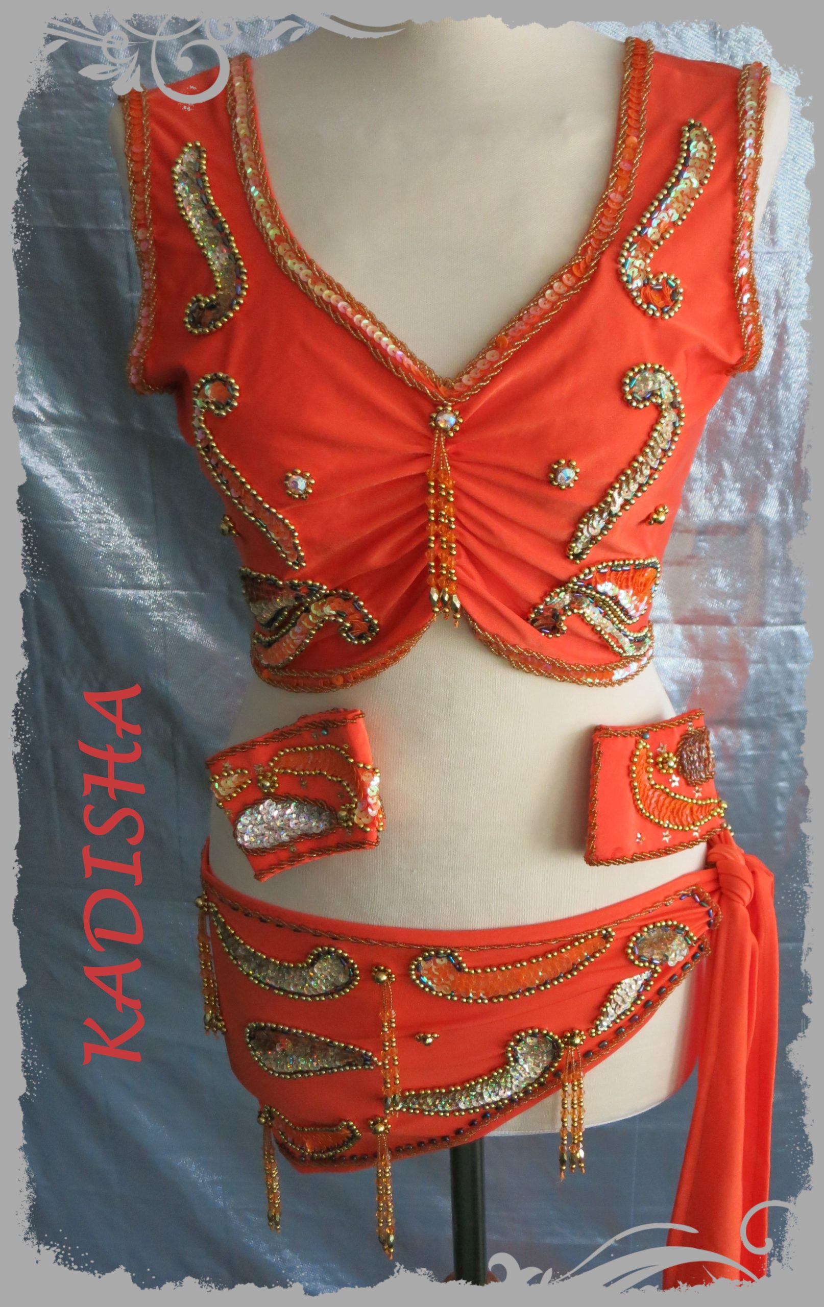 Das Set in orange ist mit goldenen und farbig irisierenden Pailletten und Perlen bestickt. Das ärmellose Oberteil in einem schönen warmen orange hat vorne 3 Straßsteine eingearbeitet. Der Armschmuck schließt mit Klett. Am Oberteil in der Mitte, sowie am Hüfttuch baumeln Perlenbüschel. Der Schnitt des Oberteils ist für den kurzen Oberkörper und eher für den kleinen Busen geeignet. Vordere Länge ab Schulternaht (Stoff) ca. 40 cm.