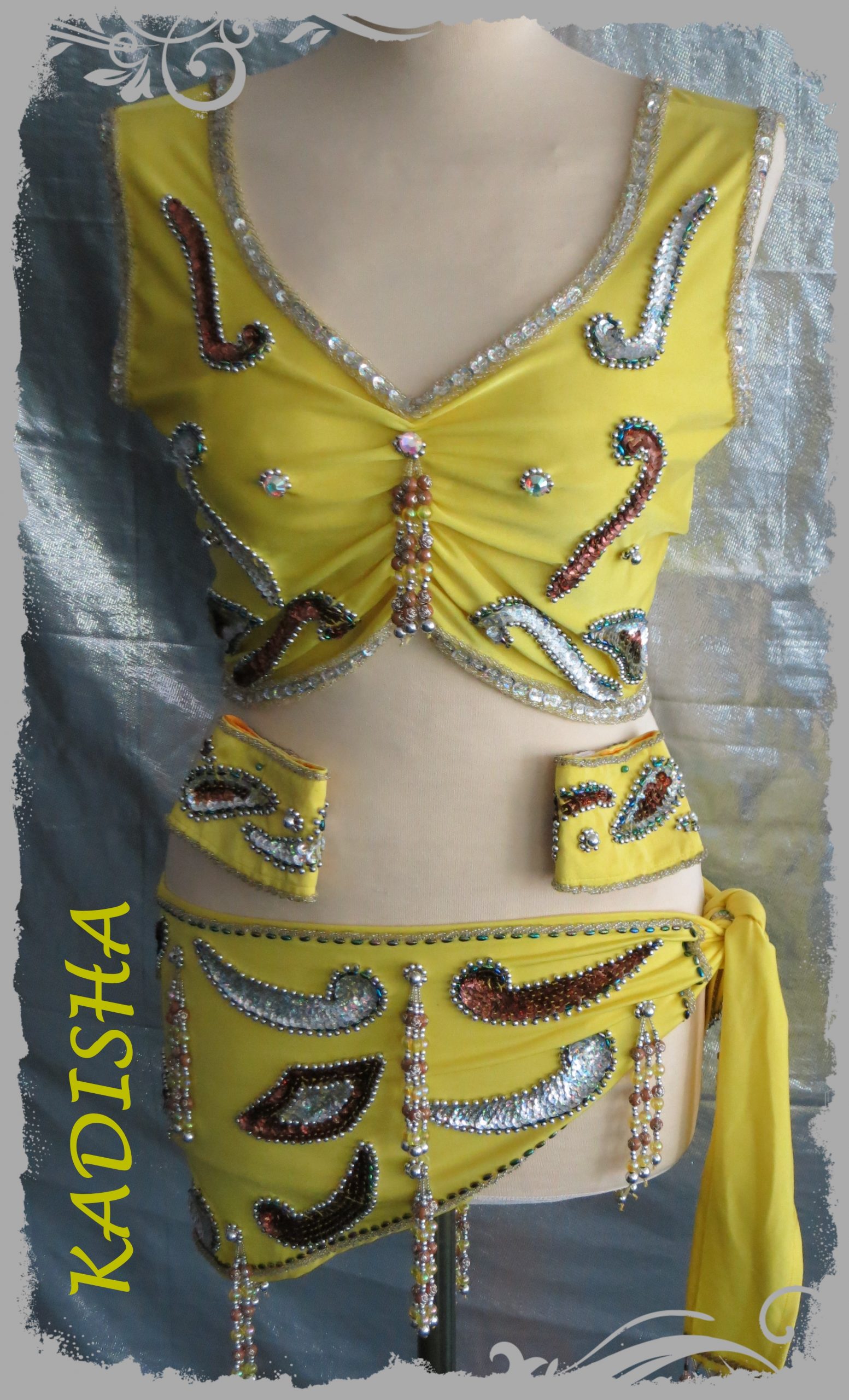 Das Set in zitronengelb ist mit goldenen und mokkafarbenen Pailletten und Perlen bestickt. Das ärmellose Oberteil in zitronengelb hat vorne 3 Straßsteine eingearbeitet. Der Armschmuck schließt mit Klett. Am Oberteil in der Mitte, sowie am Hüfttuch baumeln Perlenbüschel. Der Schnitt des Oberteils ist für den kurzen Oberkörper und eher für den kleinen Busen geeignet. Vordere Länge ab Schulternaht (Stoff) ca. 40 cm.