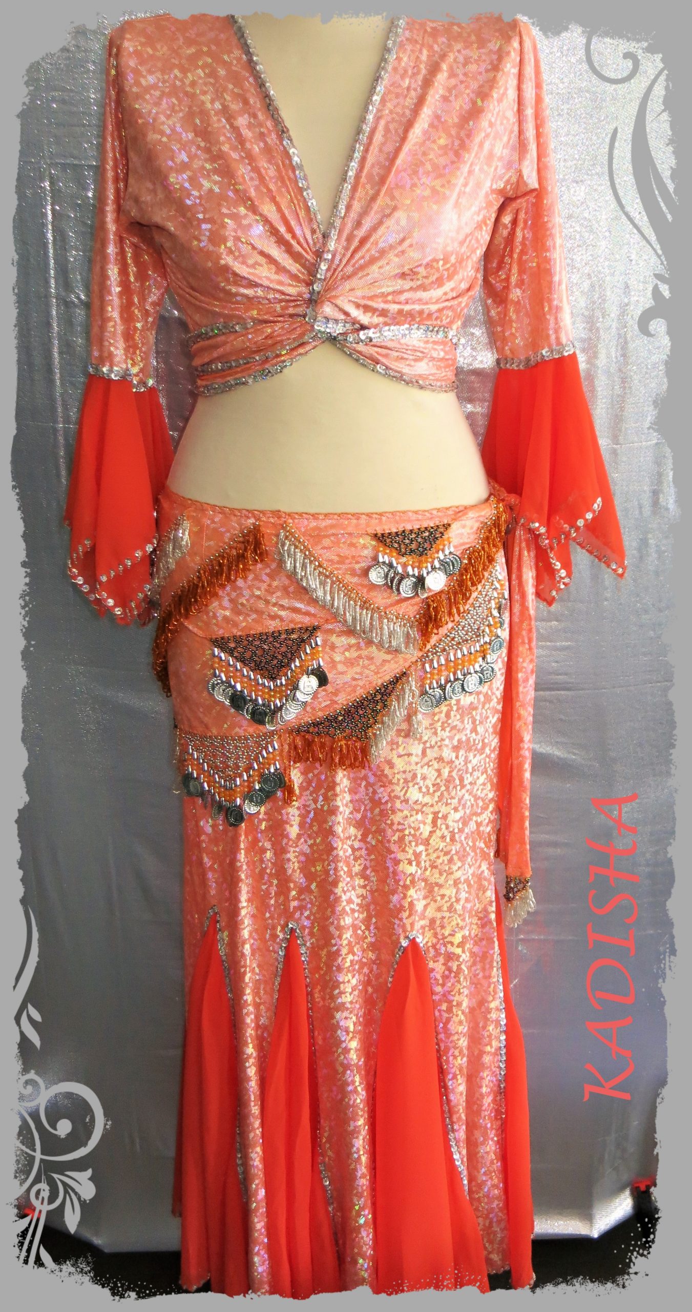 Ein glänzendes Outfit aus Holo-Lycra in der Farbe „orange“. Das Wickeltop ist mit silbernen Holo-Pailletten und Perlen bestickt und hat Ärmel mit flatternden Chiffonteilen. Das Top kann man vorne 1x gedreht ( wie auf Foto) oder übereinander legen und hinten binden.