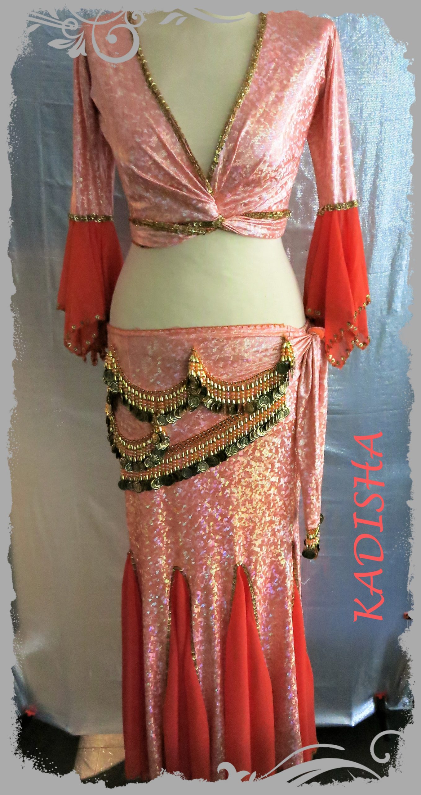 Ein glänzendes Outfit aus Holo-Lycra in der Farbe „orange“. Das Wickeltop ist mit goldenen Holo-Pailletten und Perlen bestickt und hat Ärmel mit flatternden Chiffonteilen. Das Top kann man vorne 1x gedreht ( wie auf Foto) oder übereinander legen und hinten binden.