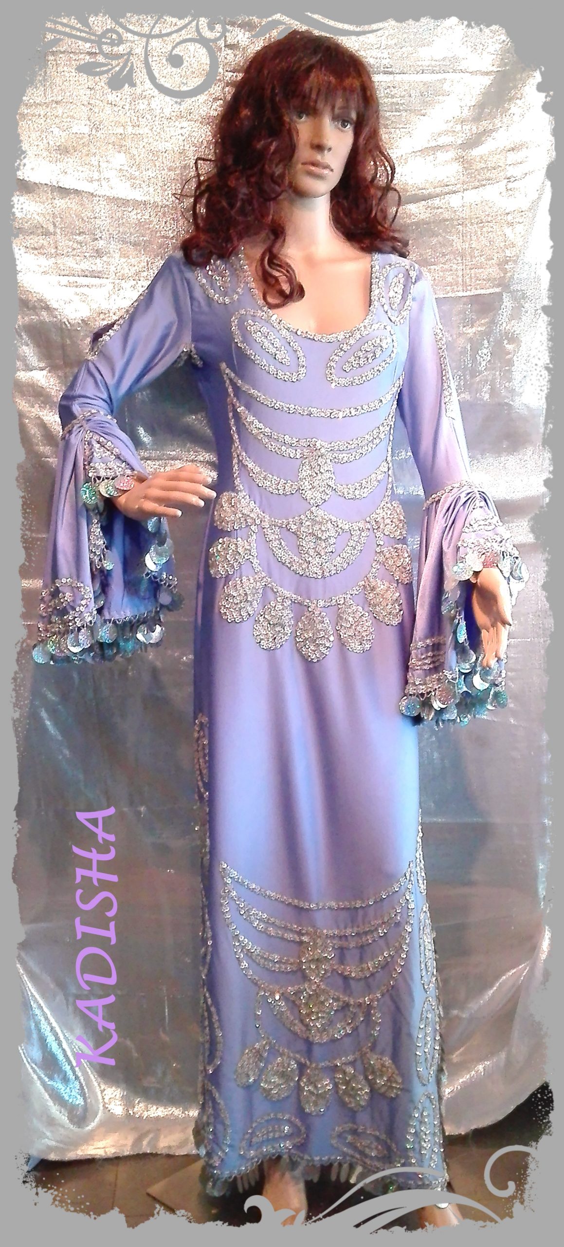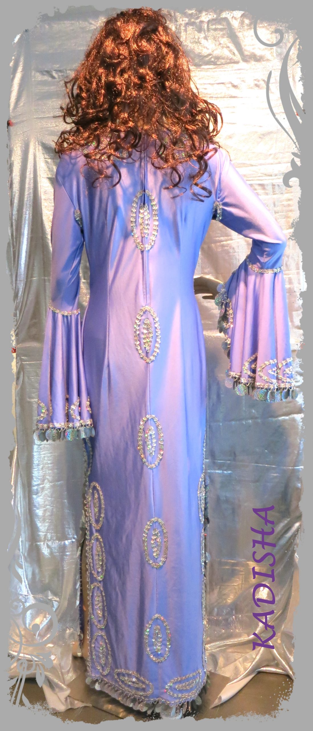 Klassisches Stockstanzkleid aus Lycra in flieder, reich bestickt auf Vorderseite mit silbernen Perlen und Pailletten. Links und rechts hat das Kleid Seitenschlitze. Saum, Seitenschlitze und Ärmel sind mit großen Holoplättchen bestickt.