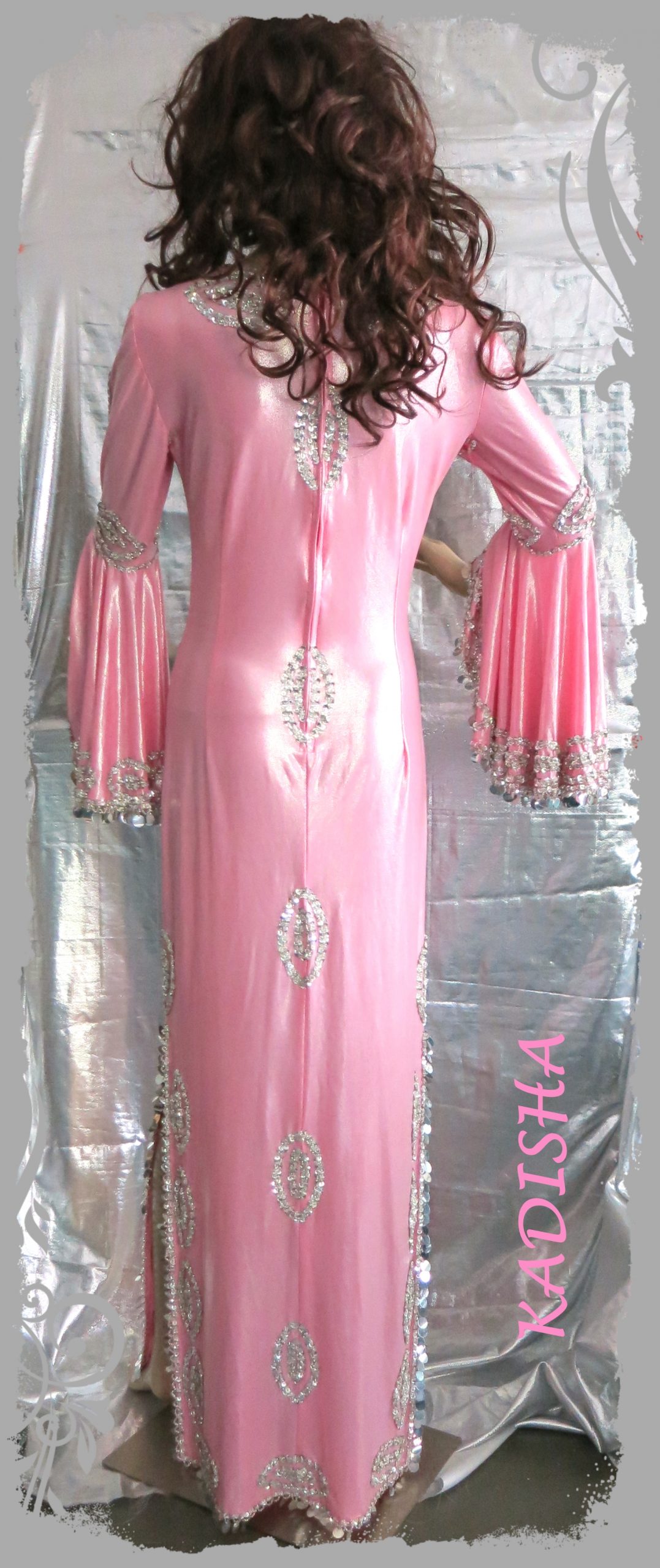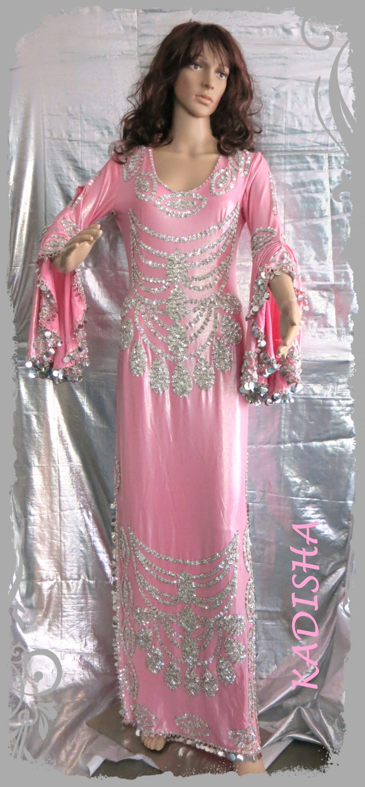 Klassisches Stockstanzkleid aus Glanz-Lycra in Rosa, reich bestickt auf Vorderseite mit silbernen Perlen und Pailletten. Links und rechts hat das Kleid Seitenschlitze. Saum, Seitenschlitze und Ärmel sind mit Silberplättchen bestickt.