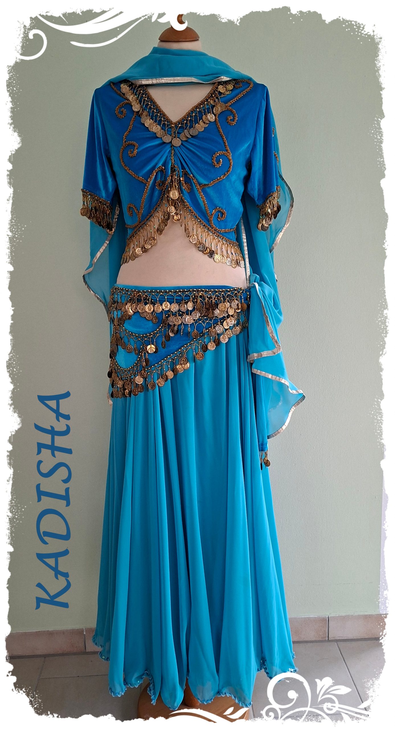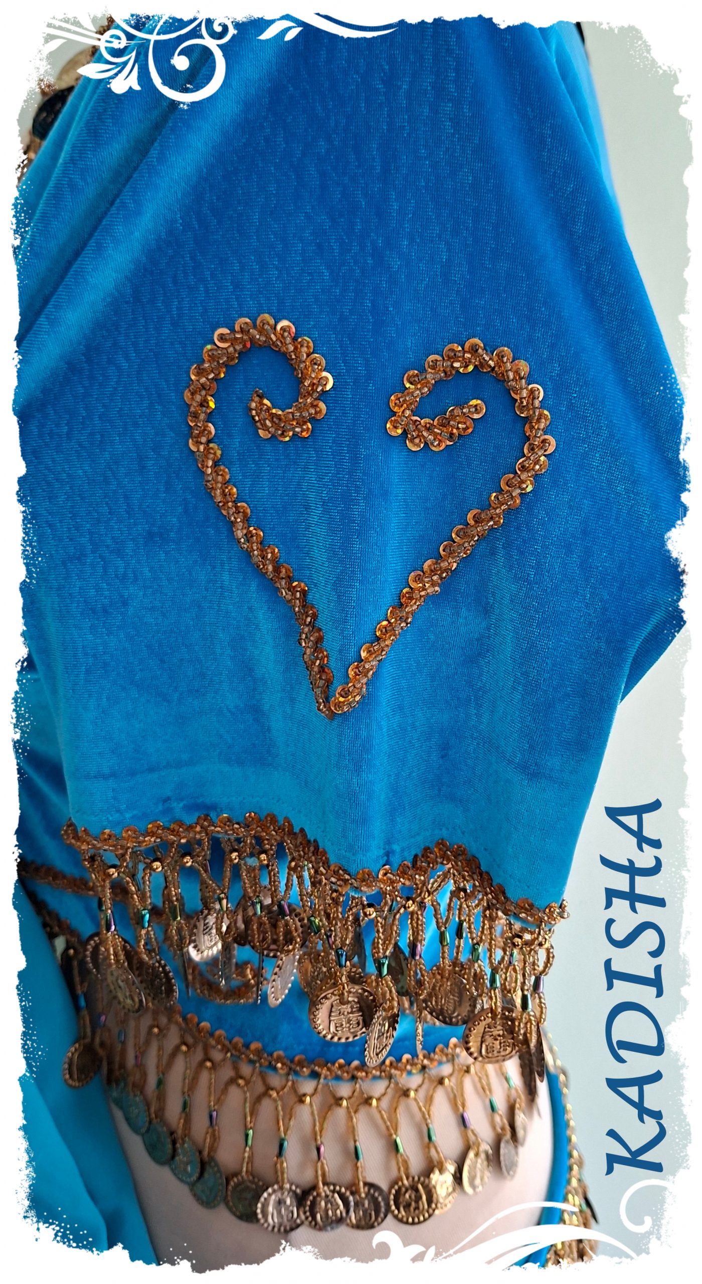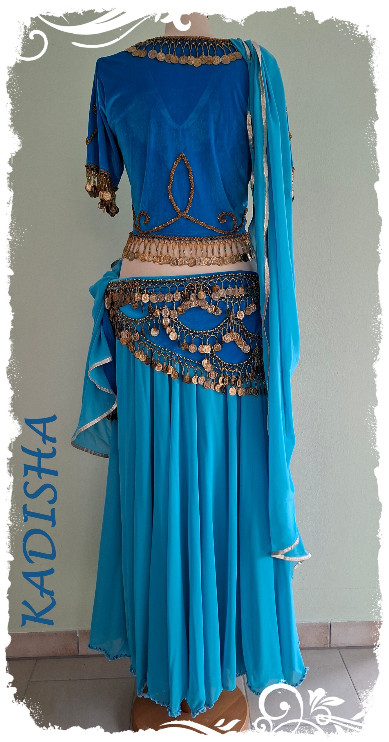 Dazu passend ein klassischer 2- lagiger Bauchtanzrock in hellem türkis. Der Rock hat 2 ganze Stoffteller und ist in 2 Lagen verarbeitet. Der Unterrock ist seitlich geschlitzt. Rundherum ist er mit goldenen Perlen und Pailletten bestickt. Der eingearbeitete Silk sorgt für einen schönen Wellsaum. Sehr attraktiv sieht es aus, wenn man eine Rockseite hoch steckt, dabei blitzt der bestickte Seitenschlitz des Unterrockes hervor.