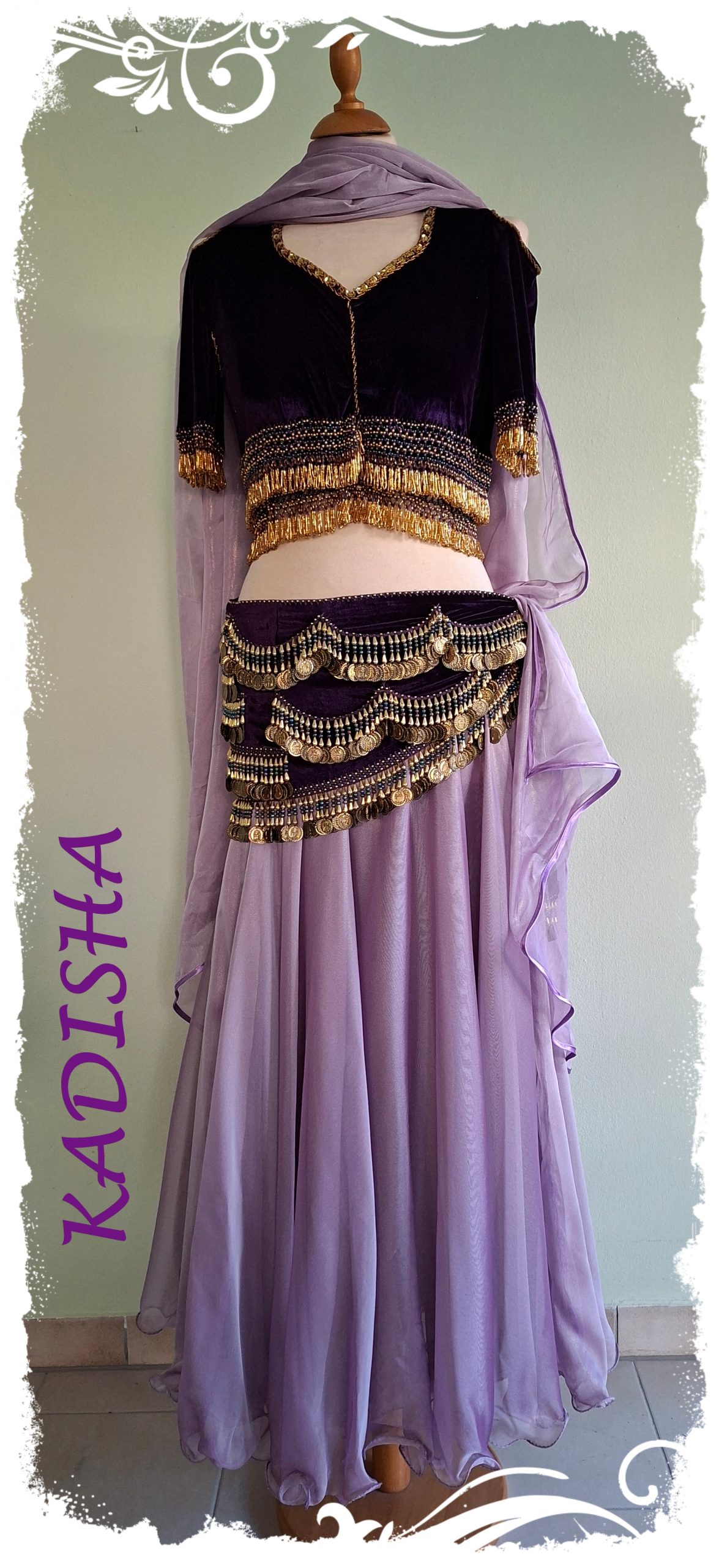 Schönes Bauchtanzkostüm in dunklem lila und schimmernden flieder.
