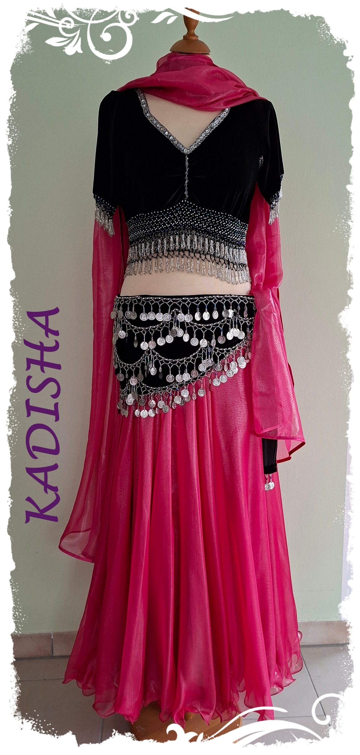 Der Rock aus Chiffon in pink ist 2-lagig und gelackt. Der schimmernde Glanz auf der Oberfläche dieses Stoffes ist umwerfend! Er ist weit schwingend und mit Silk rolliert für einen schönen Wellsaum. Passend dazu der Schleier mit pinkfarbener Borte, so passt er sowohl zu silber -oder gold bestickten Sachen wie bei diesem Modell.
